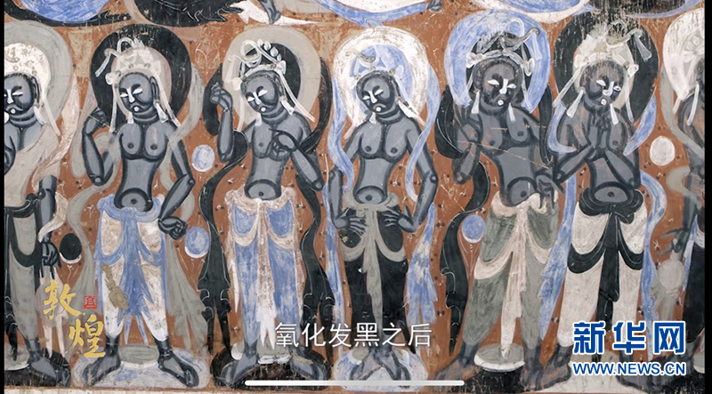 “‘敦煌仿妝’好了,我們一起去看看壁畫原作吧!”鏡頭一轉(zhuǎn),班銳從美妝博主成了穿著工作服的講解員。