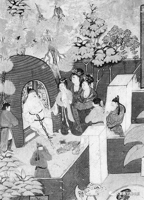 榆林窟第25窟《老人入墓圖》中,老人頭戴透額羅帽,著圓領白袍服,足蹬軟鞋,拄鏤空杖,安詳?shù)刈谀勾采希睬坝谢¢T裝飾,墓內(nèi)掛山水屏風畫。老人與親屬執(zhí)手告別,親屬八人均痛苦不堪,或用巾拭淚,或以袖掩面,或趴地叩拜。