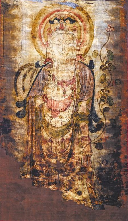 《到世界找敦煌——敦煌流散海外文物復(fù)制展》主要展出的文物為流散于英國不列顛博物館、法國吉美博物館、法國國家圖書館等海外收藏機(jī)構(gòu)珍藏莫高窟藏經(jīng)洞內(nèi)的文物復(fù)制品,展品均是按文物原比例復(fù)制,主要內(nèi)容為敦煌藏經(jīng)洞流失的南北朝、隋唐、五代、北宋等歷代絹畫、紙畫、麻布畫和經(jīng)卷等各類文物130余幅。展品除紙、絹、麻布等材質(zhì)未做還原處理外,其尺寸、色彩、完殘程度均是按文物原件高清采擷真實(shí)現(xiàn)狀呈現(xiàn)在觀眾面前。一件件質(zhì)感厚重、色彩沉穩(wěn)的藝術(shù)品,從宗教內(nèi)容闡釋,最終卻回歸于藝術(shù)殿堂,描繪出真、善、美兼?zhèn)涞睦硐朊篮弥场?/p>