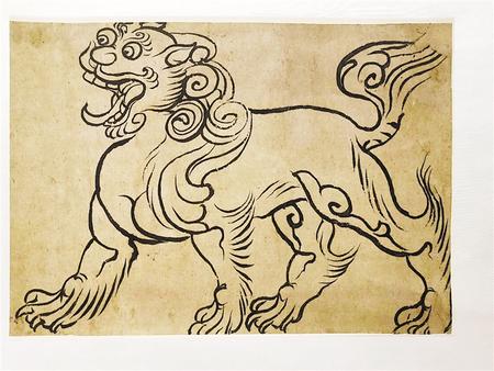 中國本無獅子,原產(chǎn)地是非洲和南美洲,約在漢武帝時(shí)才經(jīng)西域傳入。獅子作為進(jìn)獻(xiàn)的禮物,是敦煌壁畫中最早出現(xiàn)的動(dòng)物形象之一。由于它的勇猛威儀備受佛教推崇,故在造像和壁畫中曾出現(xiàn)大量的獅子元素。除此,獅子形象還被吸納成為陵墓裝飾和傳統(tǒng)建筑的基本元素。這幅紙本畫,造型準(zhǔn)確、健壯飽滿,昂首闊步、氣宇軒昂,線條遒勁、中鋒用筆,彈性十足,顯示出畫家嫻熟的造型功底,長短弧線勾勒卷毛,寥寥數(shù)筆,卻靈動(dòng)活潑、灑脫不羈,為不可多得之線描精品。