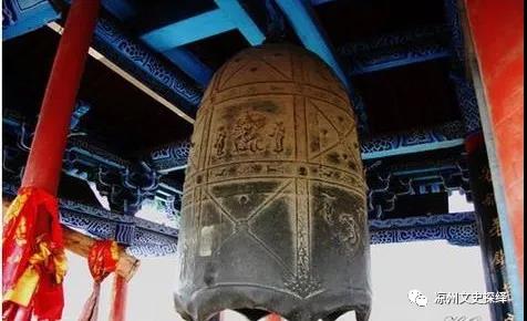 大云寺古鐘,高226厘米,口徑115厘米,厚12厘米,重約6噸,懸掛于武威大云寺鐘樓上。其鑄造時(shí)代傳說(shuō)各異,或云前涼張?zhí)戾a時(shí)所鑄,或云為唐代遺物,而最晚者謂鑄于五代。