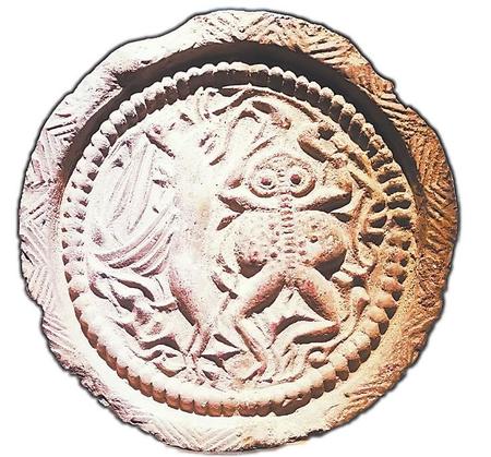 陜西淳化縣博物館收藏著一枚蟾蜍玉兔紋瓦當(dāng)。這枚蟾蜍玉兔紋瓦當(dāng)是國(guó)家一級(jí)文物,出土于咸陽(yáng)市淳化縣西漢甘泉宮遺址。瓦當(dāng)面分上、下兩部分,上半部浮雕的是一只疾奔的小兔,兩前足躍起,雙耳后豎,尾巴上翹;下半部是一只起跳的蟾蜍,圓目突起,大腹鼓圓,舌長(zhǎng)伸。瓦當(dāng)造型生動(dòng)傳神,極富生活情趣。在我國(guó)古代神話傳說(shuō)中,蟾蜍、玉兔是月宮里的動(dòng)物,這個(gè)構(gòu)圖無(wú)疑是取自嫦娥奔月的神話故事。
