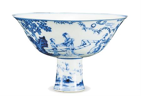 我國(guó)自古就有賞月祭月的習(xí)俗,這一習(xí)俗在文物里也有體現(xiàn),湖北省博物館收藏了一件青花瑤臺(tái)賞月圖瓷鍾。瓷鍾通高10.1厘米,口徑15.5厘米,足高4.6厘米,足徑4.2厘米,屬官窯出品,白胎,胎質(zhì)細(xì)膩,器壁光亮胎薄,叩之其聲如磬。瓷鍾上繪有“瑤臺(tái)賞月圖”,三組人物故事現(xiàn)于瓷鍾外壁:第一組有一老婦人側(cè)身坐在石墩上,身后站一侍女,雙手持扇,老婦對(duì)面站一年輕女子,其右側(cè)立一童子。第二組和第三組各有一青年女子和丫環(huán),畫(huà)面還有遠(yuǎn)山、祥云和花草。“瑤臺(tái)賞月圖”紋飾在瓷器界又被稱(chēng)為“人物紋”,較為罕見(jiàn),圖中人物共賞天上一輪圓月,與宋人所繪《瑤臺(tái)步月圖》一脈相承,意境優(yōu)美,風(fēng)格清新動(dòng)人。