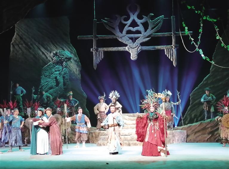 第三個步驟是大禹與土著山民首領(lǐng)山戎在強烈戲劇沖突中果斷地在改變自己的行為,并且以“忘我”的犧牲精神求得“天地之和,和在心中”的主旨意義。任何對自然生態(tài)的態(tài)度和沖突到頭來都集中體現(xiàn)在“人與人”的觀念習(xí)俗情仇恩怨的激烈紛爭之中。是故治水,也要“治理”自己的行為,升化自己的心智,以自己的真情坦露大愛, 甚或犧牲自己的性命。這就是“戲”的魅力。