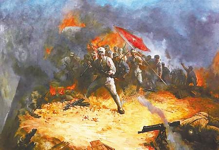 “打!不讓兔崽子抬頭!”年輕果敢的一排長,見沖不上去,便命令機(jī)槍手狠命地射擊。機(jī)槍噴射出的火舌映紅了半個(gè)天,槍聲激起的回音像暴雷似的一片轟響,子彈打得敵人陣地上的巖石直冒火星。但是仍壓不倒敵人的火力。敵人的手榴彈不停地在我方突擊道路上爆炸,進(jìn)展十分困難。