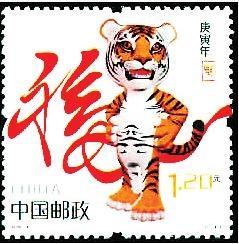 2010年1月5日發(fā)行第三輪生肖郵票第七套《庚寅年》特種郵票,全套1枚,由中央美術(shù)學(xué)院設(shè)計學(xué)院教授馬剛設(shè)計。設(shè)計者利用三維造型的特點采用擬人化的造型手法,勾勒出一只氣宇軒昂、活潑動人的卡通虎形象。