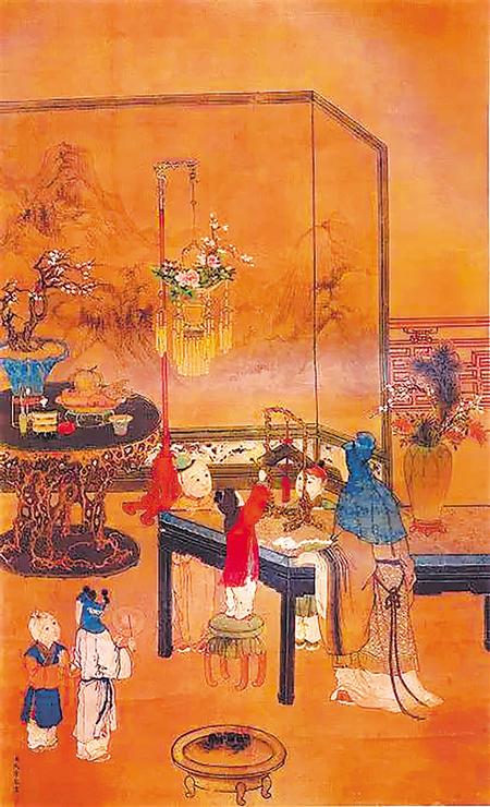 熟稔了這些歲朝清供的組合意象,就可以在單獨描摹景物之外,將其應(yīng)用到各種其他年節(jié)繪畫中了。清宮流行的嬰戲圖里,歲朝清供就作為背景或具體的物件,融入畫中。