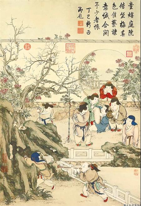 金廷標(biāo)的歲朝圖中,將嬰戲的場景置于種滿梅花和天竹的庭院中,小孩們敲鑼擊鼓吹嗩吶,洋溢著新春的吉慶熱鬧。