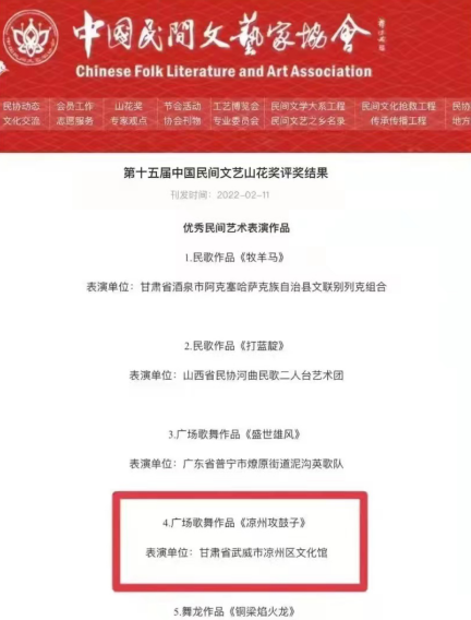 《涼州攻鼓子》榮獲第十五屆中國(guó)民間文藝山花獎(jiǎng)