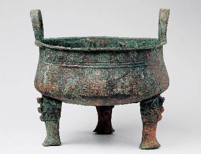 分襠三足,束腰雙柱,牛首鋬,素面,頸部飾弦紋。鋬內(nèi)族徽下有銘文。