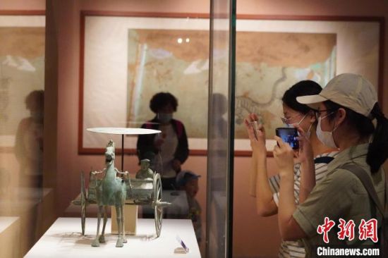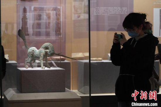 5月18日,游客來到位于蘭州的甘肅省博物館內(nèi)參觀《大道攸歸:五涼文化展》。圖為“銅獨角獸”?!【琶赖┰觥z