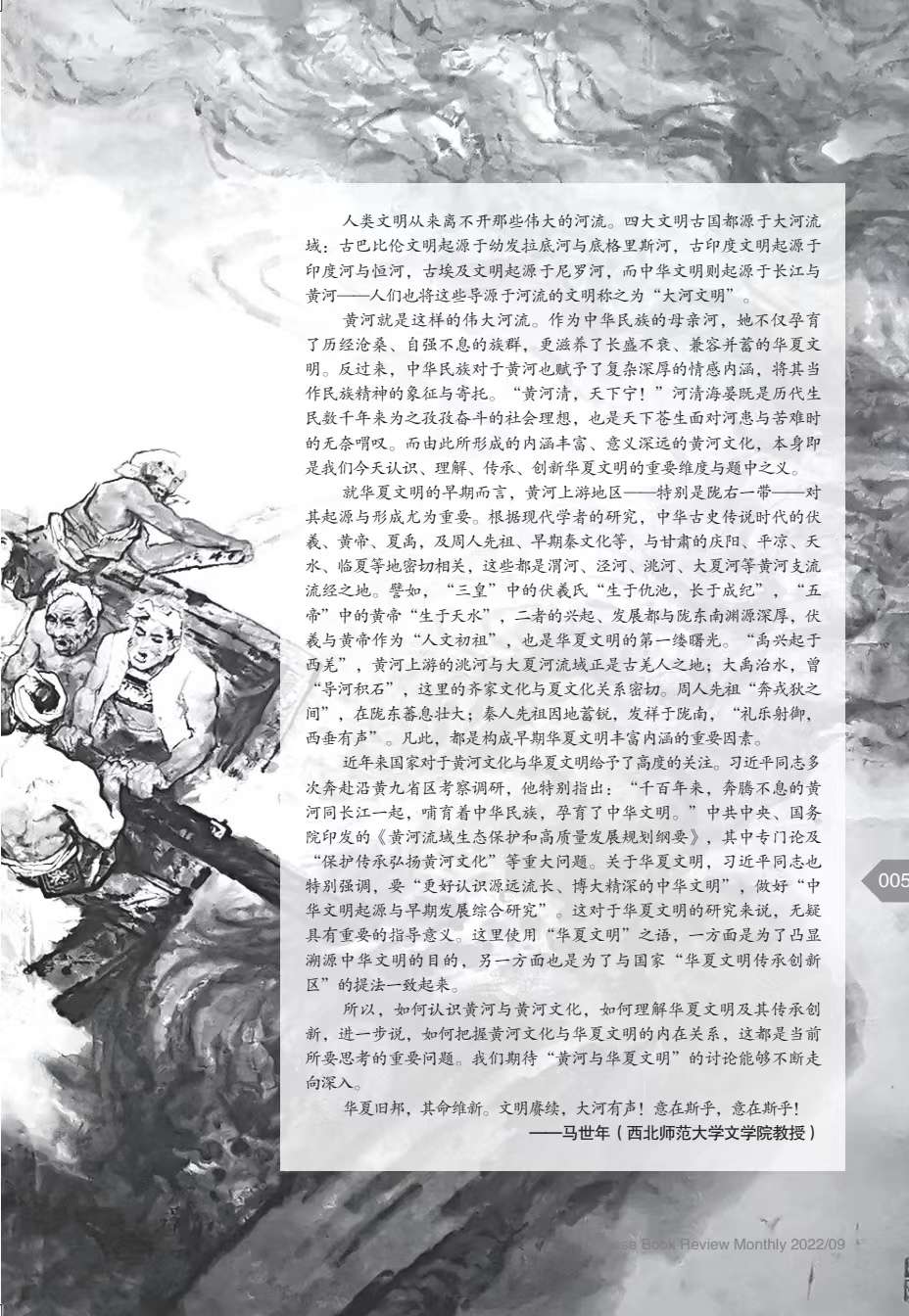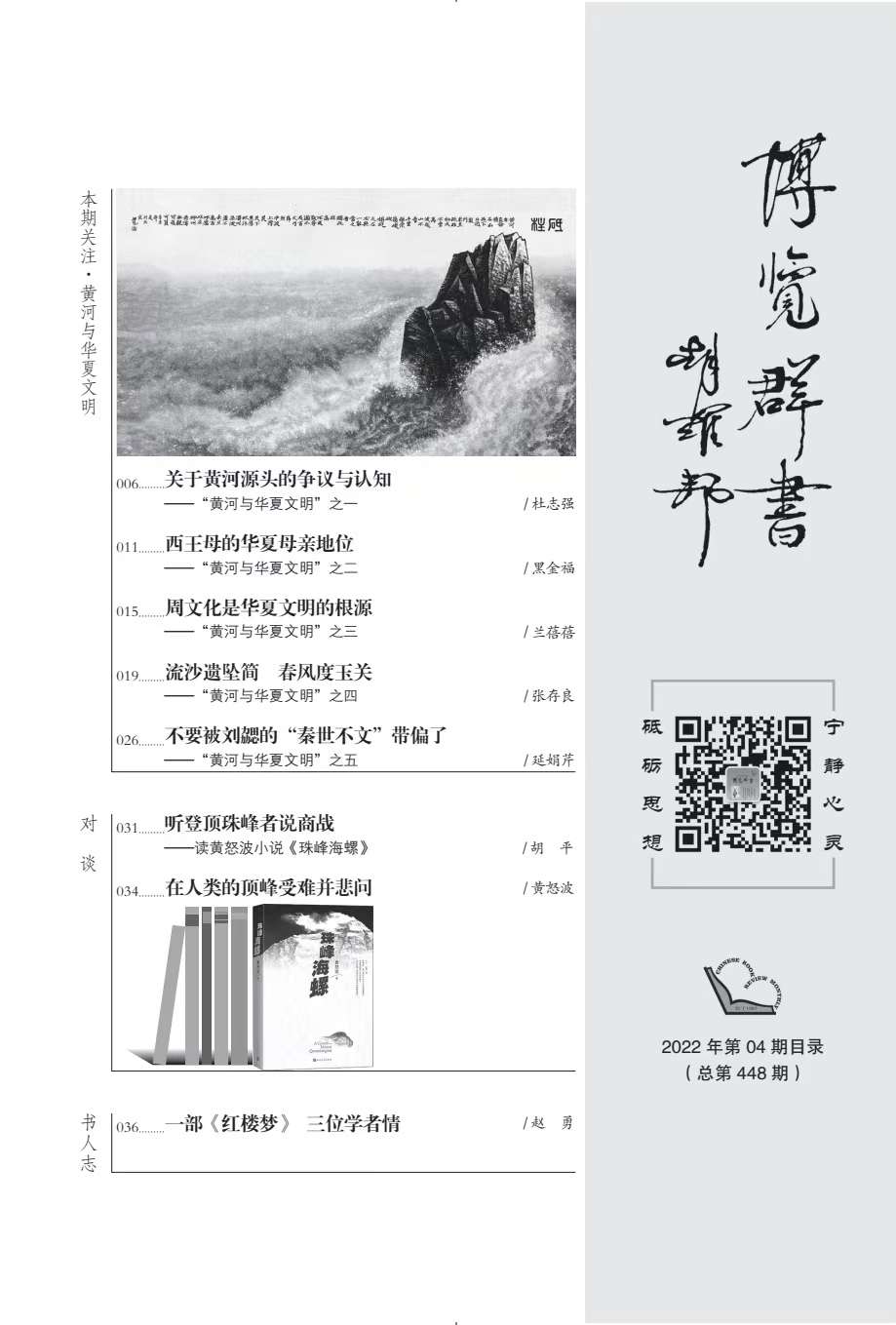 “黃河與華夏文明”系列文章(共9篇),由《博覽群書》編輯部邀約西北師范大學(xué)文學(xué)院馬世年、杜志強等著名專家策劃、組稿,作者有馬世年、杜志強、張景平、延娟芹、張存良、黑金福、劉陽杰、蘭蓓蓓等,分別刊發(fā)于《博覽群書》2022年3期、9期。系列文章著眼黃河文化,呼應(yīng)中央關(guān)于研究黃河文化的號召,探討華夏文明在黃河流域的發(fā)展、發(fā)生與傳承、創(chuàng)新;同時,欄目通過精準(zhǔn)立意、深入考證和生動表達,卓有成效地推介和普及了黃河文化,深化了國人對黃河文化的認識。已經(jīng)探討的相關(guān)論題有:歷史上關(guān)于黃河起源的爭議,黃河文化的內(nèi)涵,先周文化,秦早期文化,民族文化,西王母文化,絲路文化等。據(jù)《博覽群書》雜志介紹,鑒于這一主題的人文價值和巨大影響,編輯部將和學(xué)界更加密切配合,加強相關(guān)欄目,講好學(xué)術(shù)故事,推動黃河文化研究形成新局面和新氣象。