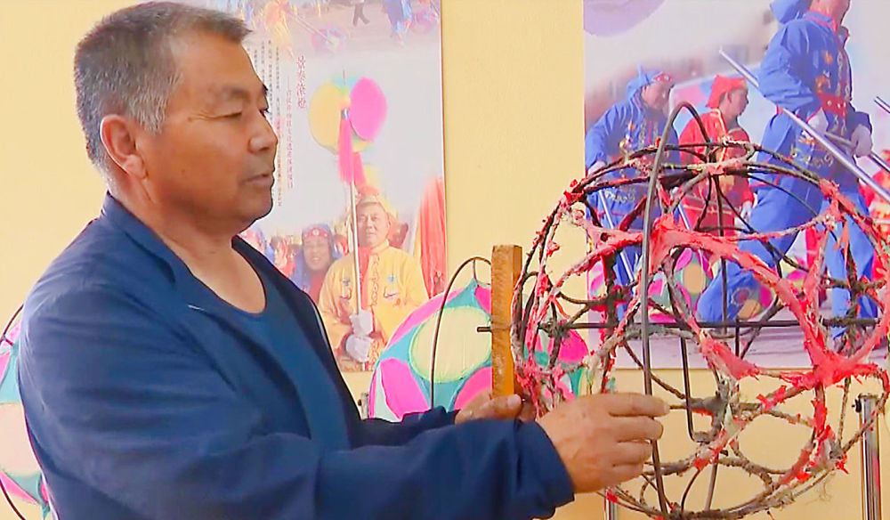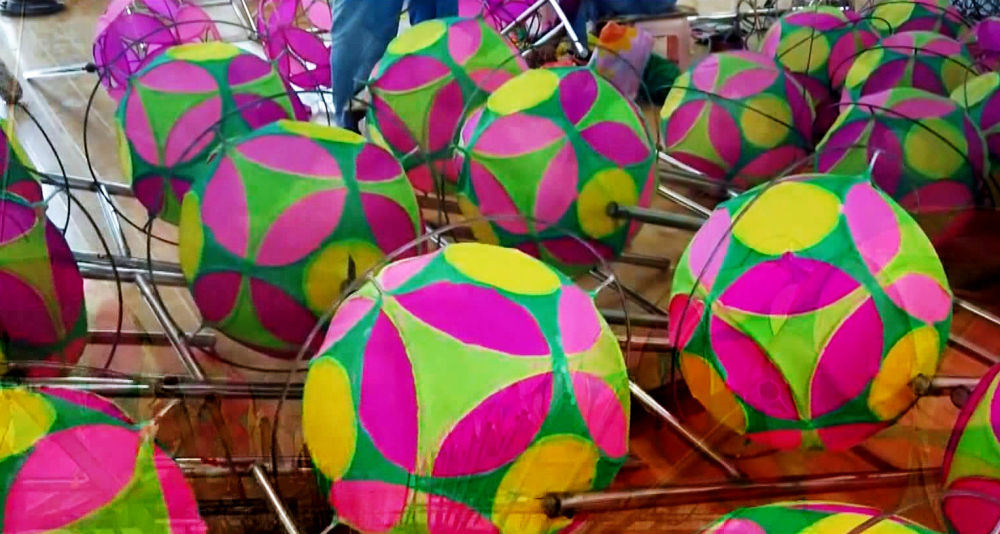 張安邦今年65歲,自其太祖輩起,代代都是技藝嫻熟的滾燈人,到他手里已經(jīng)是第三代了。明清時(shí)的滾燈,燈架、燈盤、轉(zhuǎn)軸都是木制的,花燈是用竹條或柳條編織,解放前改成了羅圈骨架,而現(xiàn)在經(jīng)過(guò)他改良的景泰滾燈,則是用高碳鋼絲制作而成。