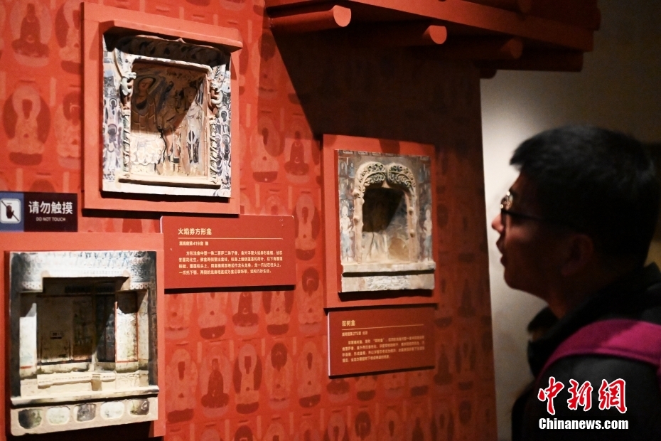 游客正在參觀“千年?duì)I造——敦煌壁畫中的建筑之美”特展上出自莫高窟第419窟的火焰券方形龕模型。(中新社記者 李亞龍 攝)