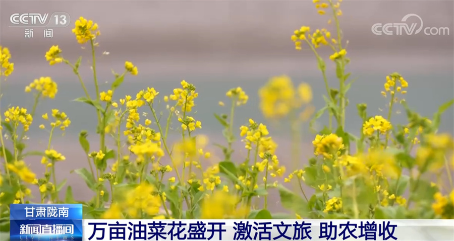 總臺(tái)記者 項(xiàng)思:這里是甘肅省隴南市文縣,位于甘肅的最南端,也是甘肅最早迎來(lái)春天的地方。一江碧水、兩岸青山,大面積盛開(kāi)的油菜花迎著和煦的春風(fēng)泛起金色的波浪,一股濃烈的春天氣息撲面而來(lái)。從春節(jié)前10天左右,這里的萬(wàn)畝油菜花就陸續(xù)開(kāi)放了。如今步入春天,油菜花已進(jìn)入盛花期。文縣接壤四川,嘉陵江的上游白龍江穿越境內(nèi),氣候溫暖潮濕,具有夏無(wú)酷暑、冬無(wú)嚴(yán)寒的氣候特點(diǎn),被稱為“隴上江南”。