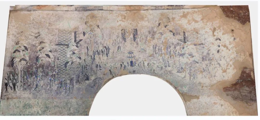 其中飛天裝飾技法的創(chuàng)新令人稱奇,如散花樓后室外側(cè)上方中間五組伎樂(lè)飛天的面部、手、足、樂(lè)器等均采取淺浮塑方式,而發(fā)髻、服飾、瓔珞、花卉、流云等則繪制而成,兩者之間的結(jié)合天衣無(wú)縫,構(gòu)成了一幅幅栩栩如生、熱烈歡快的佛國(guó)圣境。