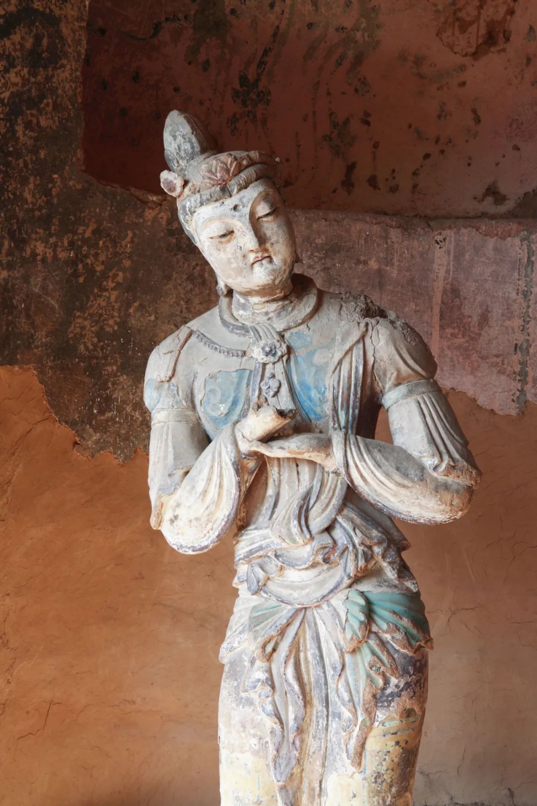 元明清時(shí)期由于政治中心東移,秦州地位下降,麥積山也步入開窟造像的衰落期,無(wú)論是窟龕造像的規(guī)模,還是造像、壁畫的藝術(shù)水平都沒有太大建樹,徹底轉(zhuǎn)變?yōu)橐惶幖兠耖g性宗教信仰活動(dòng)場(chǎng)所。元代造像主要以密宗為主,如35窟坐佛、48窟四臂觀音等;