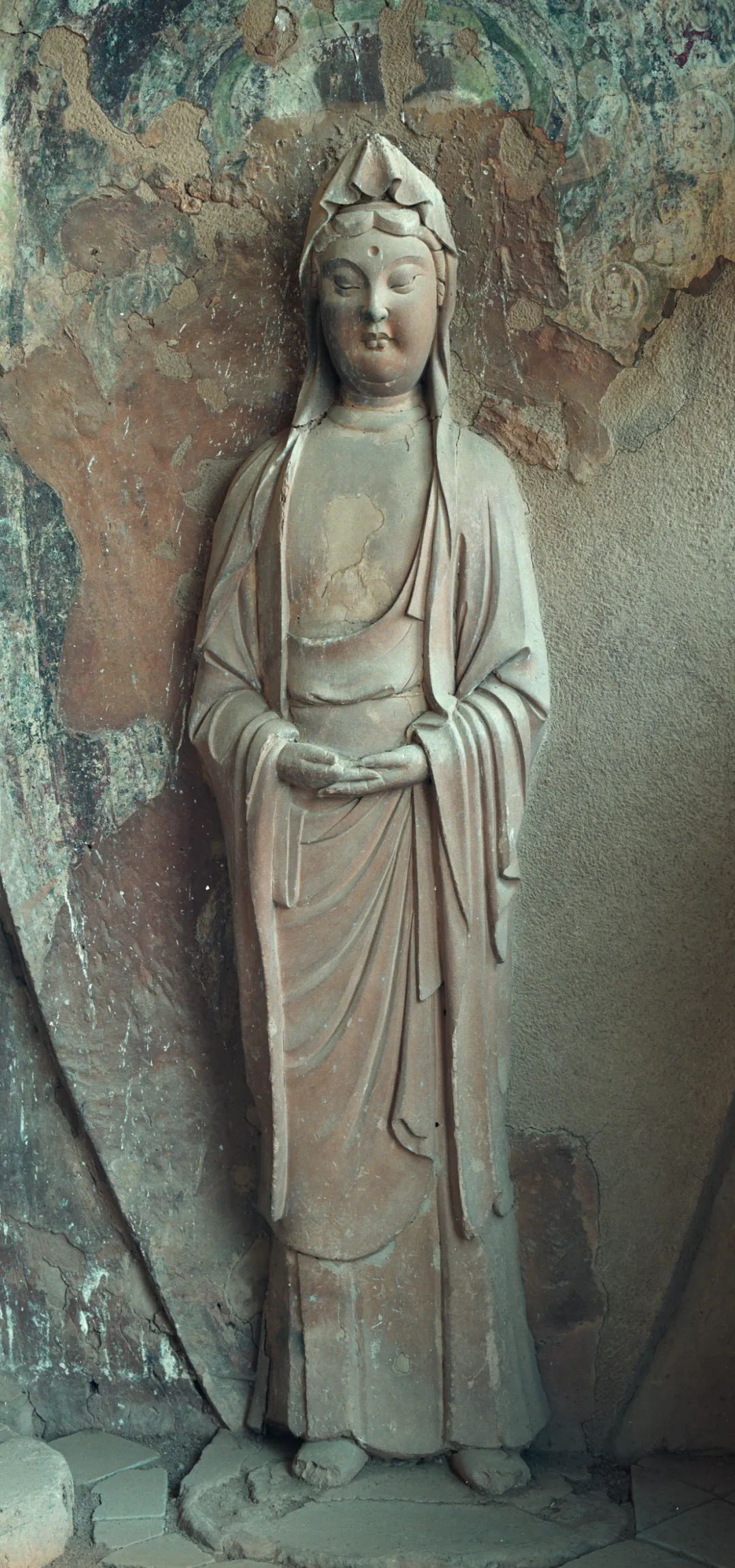 從題材上看,以單尊佛、菩薩、力士等為主,風(fēng)格上更具有寫實(shí)性。造像面相橢圓飽滿,斜眉吊目,懸鼻小口,表情森嚴(yán)、凝重,服飾簡(jiǎn)潔、質(zhì)樸,寬博厚重,極富質(zhì)感。其中佛低平螺髻,前置肉髻珠,身穿垂領(lǐng)袈裟。菩薩束發(fā)高髻或戴風(fēng)帽,眉目慈祥,身材比例協(xié)調(diào)、準(zhǔn)確。力士表情生動(dòng)傳神,體形孔武雄健,充滿陽(yáng)剛之氣,給人以強(qiáng)烈的力量和威武感;這段時(shí)間造像前衰后盛也與當(dāng)時(shí)秦州所處環(huán)境有密切關(guān)系。