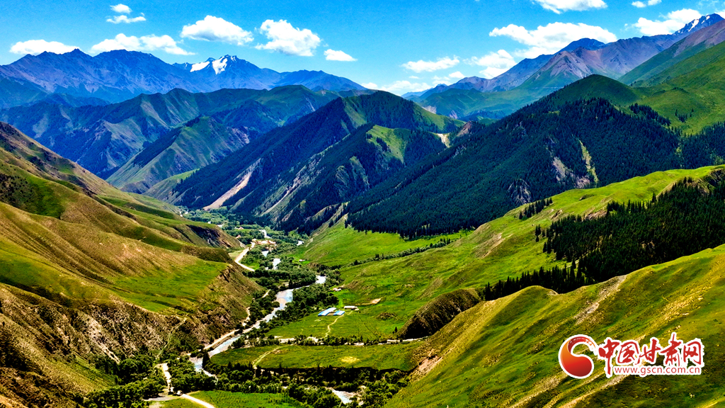 7月22日,祁連山國家公園甘肅省張掖市肅南裕固族自治縣大河鄉(xiāng)段,藍天白云下,巍峨壯麗的祁連山蒼松翠柏矗立其間,綠草如茵、水光粼粼,如同一幅壯美與秀麗并存的山水畫卷。