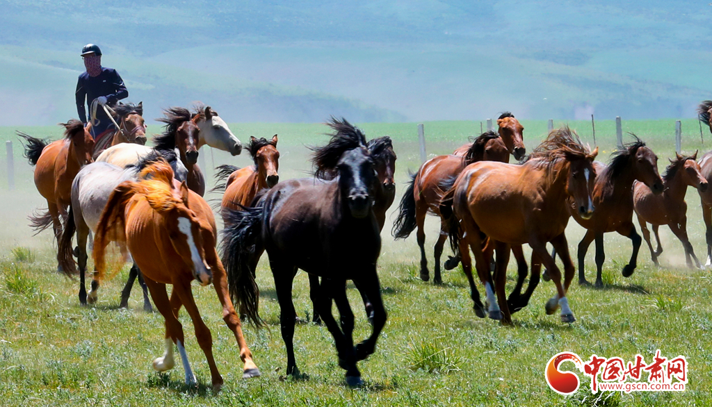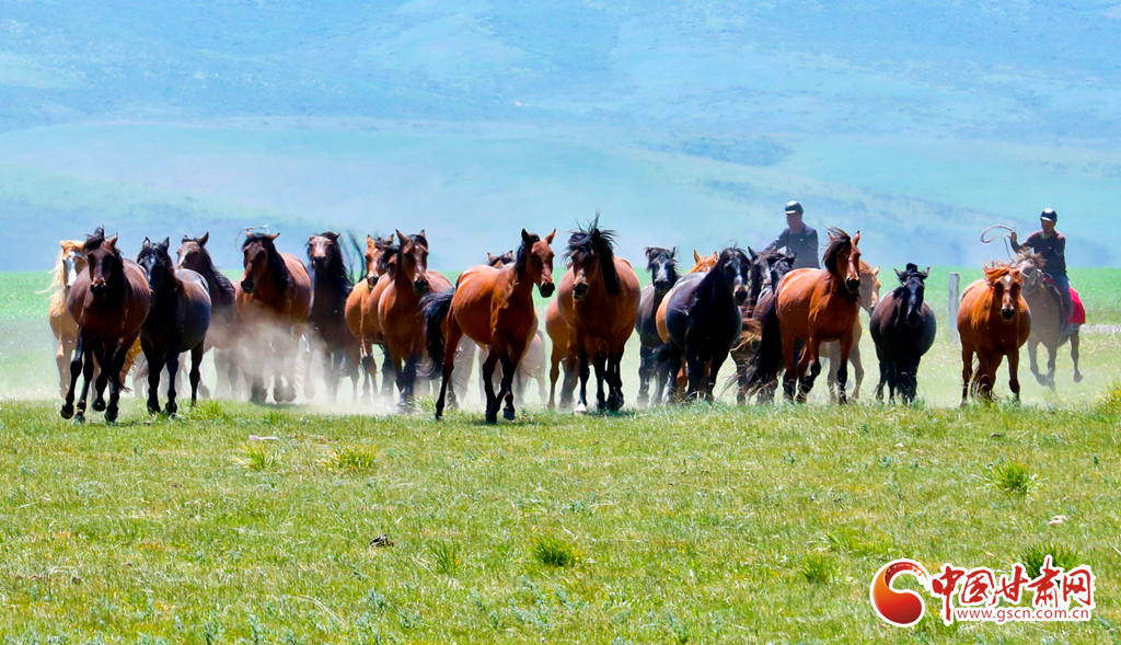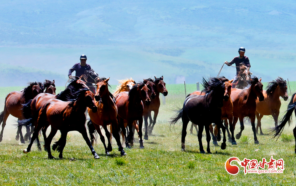 7月25日,位于祁連山北麓的甘肅省張掖市山丹馬場駿馬奔騰,吸引了眾多游客駐足觀賞。