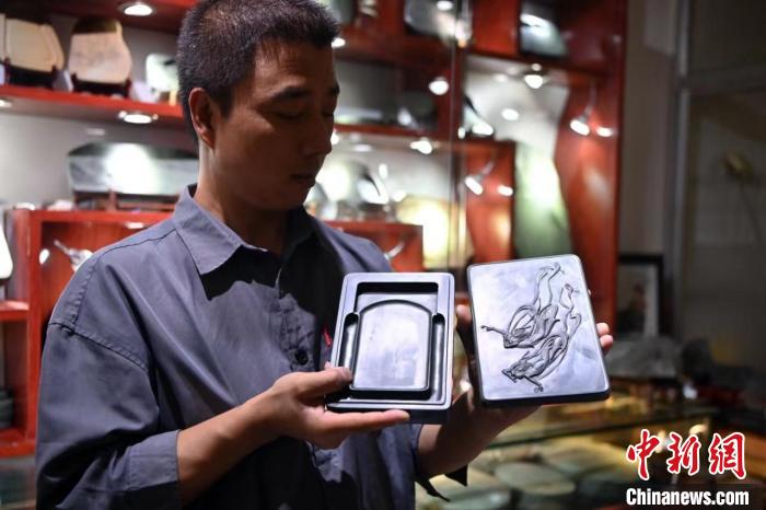 圖為洮硯手藝人李江平展示“雙飛天”洮硯作品。(資料圖)中新社記者 九美旦增 攝