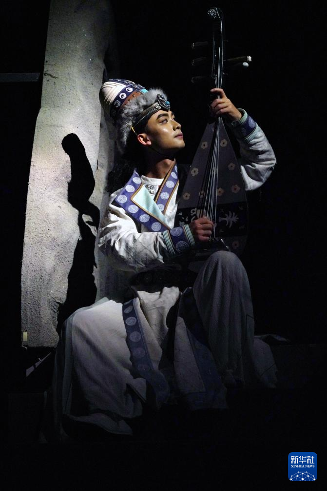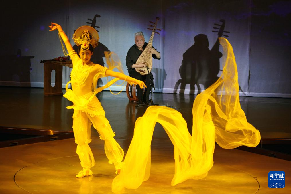 8月9日,在《樂動(dòng)敦煌》演出現(xiàn)場(chǎng),敦煌古樂全球推廣大使、國(guó)樂藝術(shù)家方錦龍演奏琵琶,為舞蹈演員伴奏。新華社記者 馬寧 攝