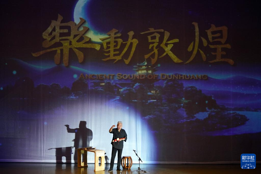 8月9日,在《樂動(dòng)敦煌》演出現(xiàn)場(chǎng),敦煌古樂全球推廣大使、國(guó)樂藝術(shù)家方錦龍?jiān)谙蛴^眾介紹傳統(tǒng)音樂。新華社記者 馬寧 攝