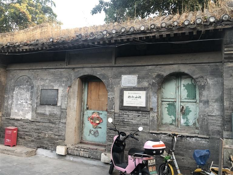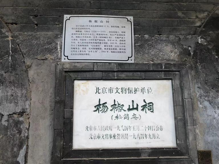 就是在這個胡同里,我看到一個歇山式屋頂?shù)姆课?,但已相當?shù)钠茢?,屋頂上長滿了凄凄荒草,門窗皆已破爛不堪。但是門旁的墻壁上卻鑲嵌著一塊匾,近前一看,上面寫著“楊椒山祠”。喲,這就是楊椒山在北京的祠。