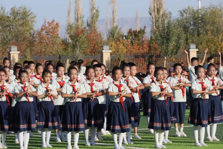 敦煌中學(xué)學(xué)生在操場做敦煌舞課間操。張曉亮 攝