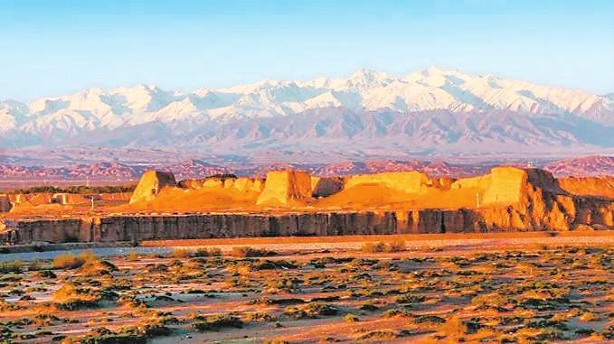 在遠(yuǎn)山映襯的曠野中,一條筆直的公路向祁連山深處延伸,沿途蜿蜒的古長(zhǎng)城遺址隨處可見(jiàn),烽燧關(guān)城遍布高山隘口、河流岸邊、大漠戈壁,形成了獨(dú)特人文歷史景觀,位于遠(yuǎn)處的驪靬古城時(shí)隱時(shí)現(xiàn)。