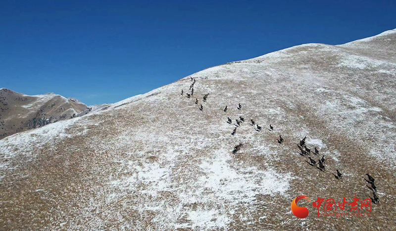 春日的祁連山仍有積雪覆蓋,大種群馬鹿沿著山坡覓食前行,時而漫步,時而奔跑,場面非常壯觀,成為保護區(qū)一道靚麗風景,也給寂靜的山嶺增添了生機與活力。