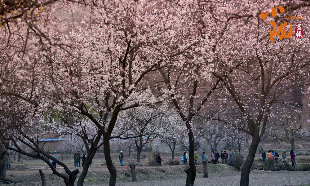 遠遠望去,到處是枝節(jié)橫生的杏樹,處處是農(nóng)家小舍,隱藏其中,人在花中,花在眼前。前來賞花的游客蜂擁而至,在杏園里駐足拍照,流連忘返。