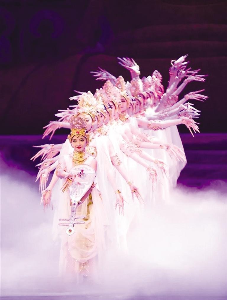 經(jīng)典舞劇《絲路花雨》歷經(jīng)45載,累計(jì)演出3952場(chǎng),觀眾達(dá)537.47余萬(wàn)人次,享有“中國(guó)民族舞劇的典范”“東方的《天鵝湖》”之稱。演出現(xiàn)場(chǎng),劇中經(jīng)典舞蹈選段《金光千佛》《反彈琵琶》《霓裳羽衣舞》《夢(mèng)幻伎樂(lè)天》為游客粉絲和廣大觀眾繽紛綻放,引發(fā)陣陣歡呼。“反彈琵琶”源自莫高窟第112窟的反彈琵琶樂(lè)舞圖,“千手觀音”還原了莫高窟元代3窟中的千手千眼觀音圖,“活著的敦煌壁畫(huà)”、獨(dú)創(chuàng)的“S”形舞姿讓游客沉浸式感受絲路文化藝術(shù)的魅力。