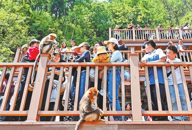 游客在隴南市武都區(qū)裕河鎮(zhèn)與川金絲猴親密接觸。新甘肅·甘肅日報記者 丁凱