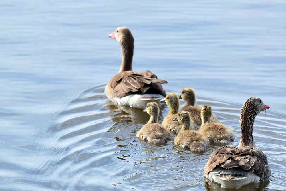 灰雁是鴨科雁屬鳥類,屬國(guó)家重點(diǎn)保護(hù)的“三有”鳥類,也是陽(yáng)關(guān)濕地的夏候鳥。監(jiān)測(cè)顯示,在陽(yáng)關(guān)濕地繁殖的灰雁家族有100多只。每年3月下旬遷飛至陽(yáng)關(guān)濕地,4月中旬筑巢繁殖,5月上旬孵化出雛鳥4至5只。灰雁為“一夫一妻”制,孵化由雌鳥單獨(dú)承擔(dān),雄鳥在巢附近負(fù)責(zé)警戒。待雛鳥破殼出窩后,則由雌雄共同撫育?;已闵阅懶?、機(jī)警,小寶寶溜達(dá)時(shí),雌鳥在前開道,雄鳥負(fù)責(zé)斷后,小寶寶上岸覓食嫩草芽時(shí),雄鳥仍然負(fù)責(zé)警戒,若有危險(xiǎn)立刻鳴叫警示。故而,近距離拍攝灰雁雛鳥是比較困難的。