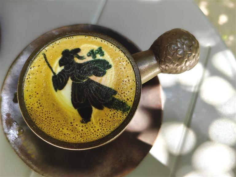 驚喜還有很多,就像店內(nèi)柜體上的一句話“可以讓大家體會到我們不一樣的用心”,這些年輕人用心起來還真能撬動地球。飲品和咖啡,設(shè)計(jì)團(tuán)隊(duì)愣是把口味和地域文化結(jié)合起來,整出了幾款“限量版”:城市限定——沙橙暴飲品,西北特有;特調(diào)咖啡——苦水玫瑰特調(diào),讓人一口難忘之余還配上了臺詞,“苦水玫瑰有點(diǎn)甜”;“文物咖啡”更是占據(jù)“C位”,咖啡拉花機(jī)“印制”而成的微縮版銅奔馬、蛙紋罐、銅車馬等文物圖案浮在濃郁的咖啡上,精致、唯美。這還不算,咖啡器皿的名稱也非同尋常——鷹首權(quán)杖杯。陶瓷來自景德鎮(zhèn),手柄是省博鷹頭形青銅權(quán)杖首的文物原型。驚嘆、贊美、感慨,每一位品嘗之人喜愛之余竟不忍飲用。