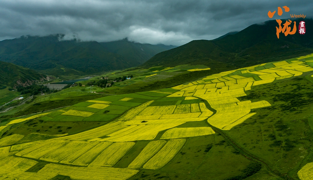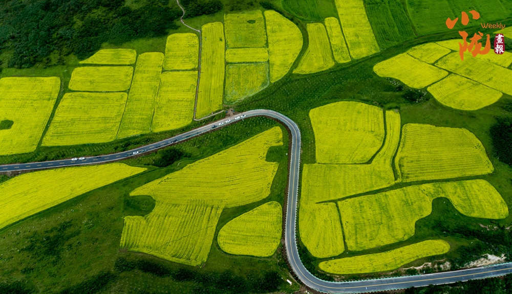 黃燦燦的油菜花鋪蓋在逶迤的山坡上,染盡山野,與此起彼伏的祁連山脈、古樸的民舍、一望無際的田野,共同繪就了一幅極具藝術(shù)感的“油畫”。