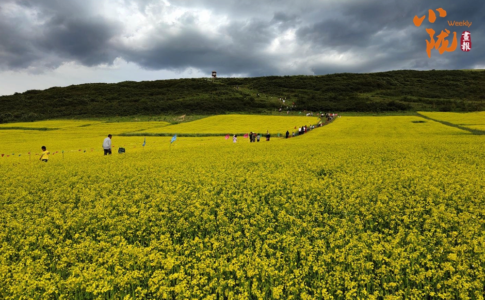 一場細(xì)雨過后,微風(fēng)吹拂,金黃色的花朵隨風(fēng)搖曳。游客們置身花海,賞花、拍照,盡情享受大自然饋贈(zèng)的田園詩意。