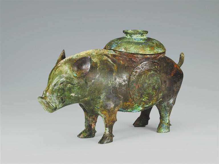山西省曲沃縣北趙村晉侯墓地113號(hào)墓出土。豬尊出土于第一代晉侯燮父的夫人墓中。背上有蓋,蓋面飾云雷紋。器腹兩側(cè)各飾同心圓渦紋,周圍飾變形獸面紋。蓋內(nèi)及外底均有銘文:“晉侯乍(作)旅飤(sì)”。“飤”通“食”,多用于青銅食器上,而此尊應(yīng)是盛酒器,在酒器上自銘為飤,較為罕見。豬是伴隨著農(nóng)業(yè)文明的出現(xiàn)而成為最早飼養(yǎng)的動(dòng)物之一,先秦時(shí)期多用作祭祀活動(dòng)的祭牲。晉侯墓地出土的豬尊,將酒器青銅尊鑄成日常生活中豬的形象,造型逼真,憨態(tài)可掬,工藝精湛,充分體現(xiàn)了青銅工匠的聰明才智。