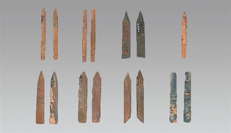 山西省絳縣橫水墓地出土。身呈長(zhǎng)條形,中部起脊,兩刃斜直,刃緣鋒利,劍身橫截面呈菱形。莖格部平面呈“凸”字形,有闌,側(cè)闌凸起,橫截面呈“工”字形,后端較窄,有兩個(gè)圓穿。劍身近莖格處兩面均飾陰線人面紋。雙合范鑄造。兩面人面紋頭頂上方鑄銘文:“楚公逆□□中戈。”考古人員推斷,有可能該件器物的作器者為楚公逆,與晉侯墓地M64出土的楚公逆編鐘、宋代嘉魚縣出土的楚公逆鐘的作器者為同一人。
