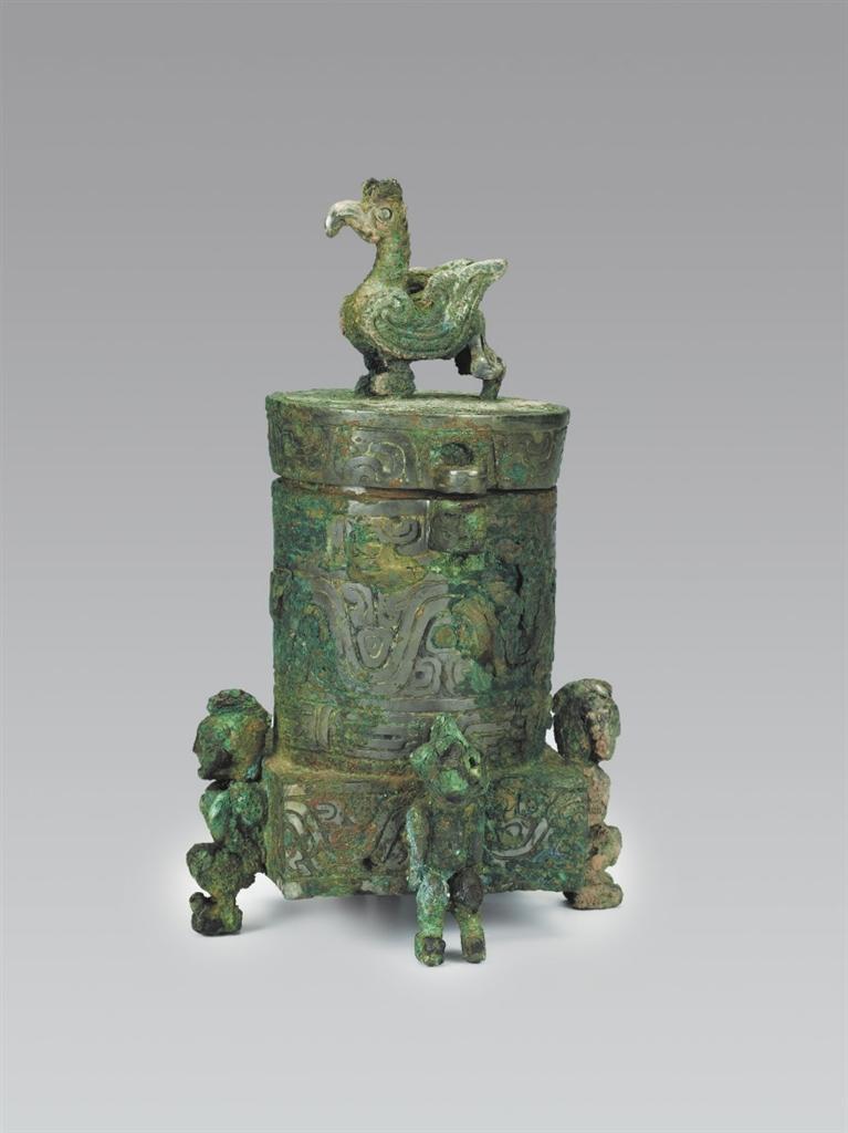 山西省曲沃縣北趙村晉侯墓地63號(hào)墓出土。圓筒形,帶蓋,蓋與器體以子母口套合,蓋平頂,上有圓雕立鳥形鈕,鳥彎喙,雙目圓睜,作展翅欲飛狀。器為平口,口沿有一對(duì)貫耳,直壁,方形底座,底座四壁各有一個(gè)人形足以承器體。人發(fā)髻高聳,赤身裸體,屈膝下蹲,作奮力抬舉器物狀,形象寫實(shí)生動(dòng)。方座飾波曲紋,內(nèi)底有兩只小鈴,可發(fā)聲。蓋頂飾斜角云紋一周。蓋沿和口沿飾變形獸體紋,筒腹和方座飾波曲紋,筒下層飾鱗紋一周。這種形制的青銅器尚屬首見,其功用還有待于深入研究,但它獨(dú)特的藝術(shù)造型和裝飾卻可以說是集眾器之長(zhǎng),獨(dú)步天下。