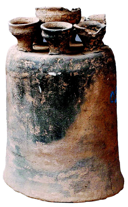寺洼文化灰陶聯(lián)盞,通身為泥質(zhì)灰陶,主體呈一倒扣的鐘形,在鐘形體的頂端粘連著七個豆?fàn)畋K杯。其中中間一個稍大略高,其他六個稍小一些,等距分布在中央一個的周圍,呈眾星拱月之狀。