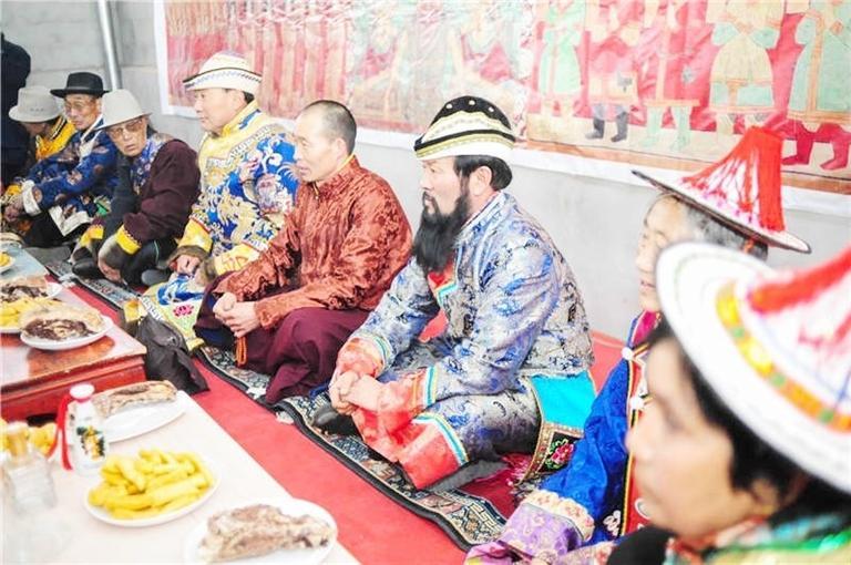 送親隊伍來到時,迎親的人們向女方客人贈送哈達(dá),表示敬意。然后,送親的人下馬飲酒吃飯,謂之“打尖”。