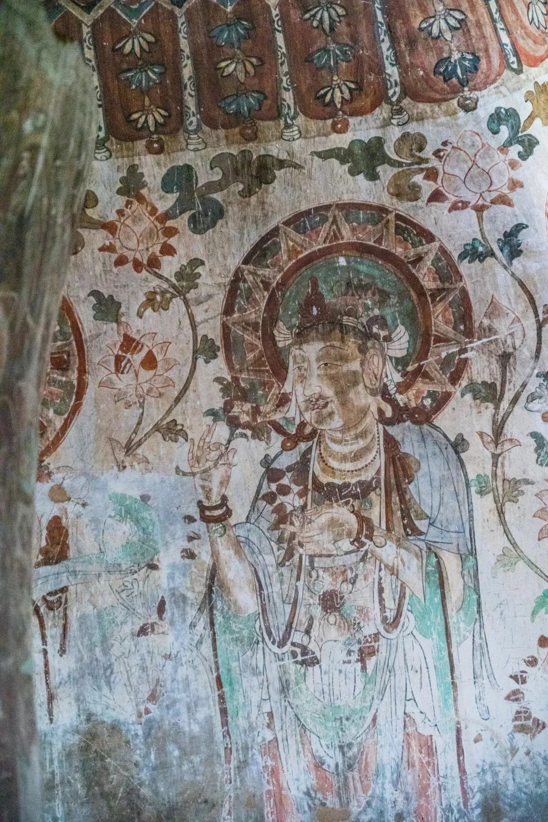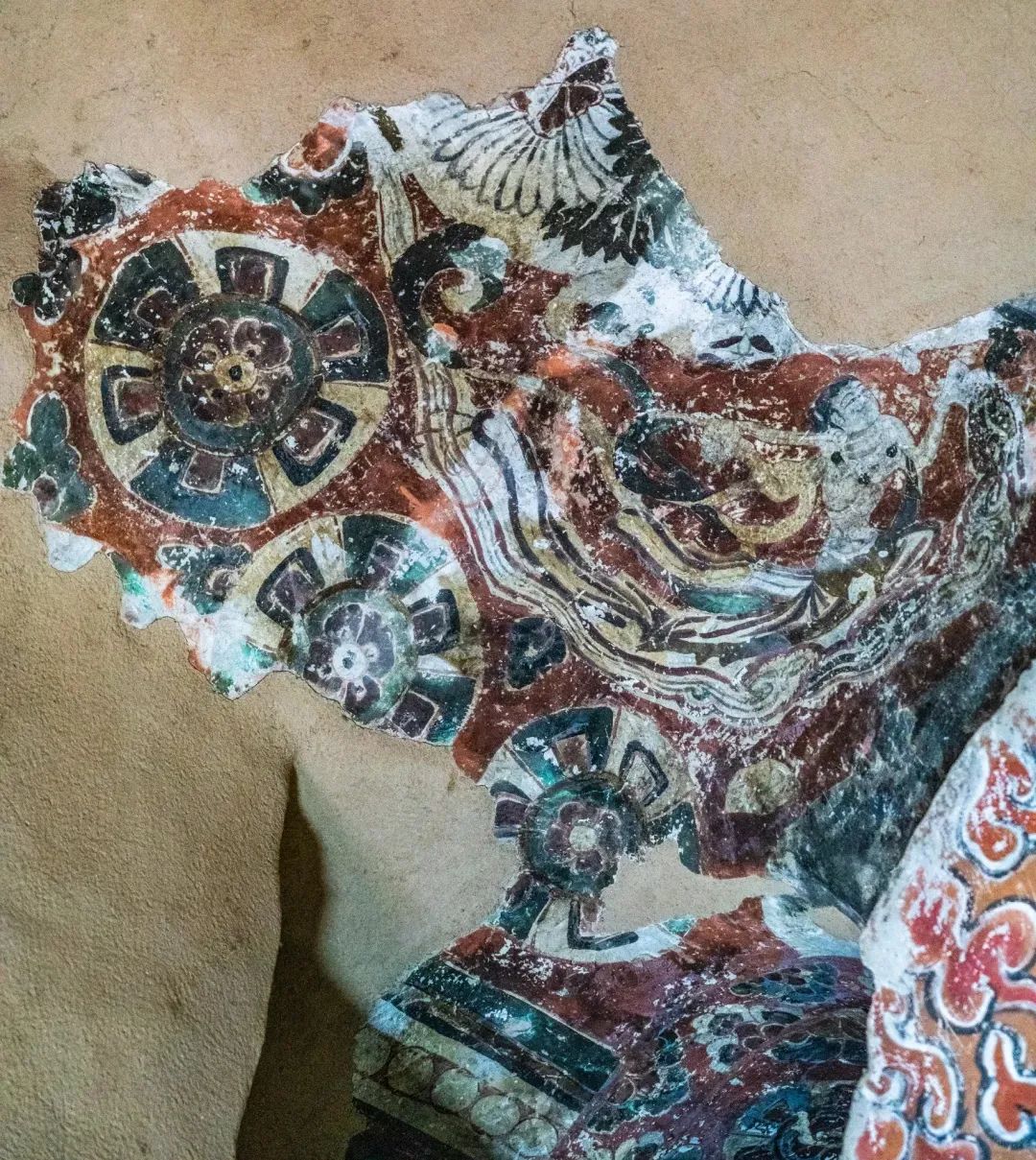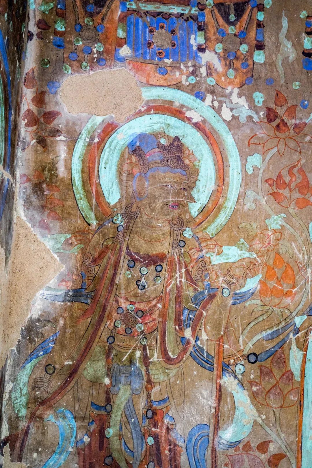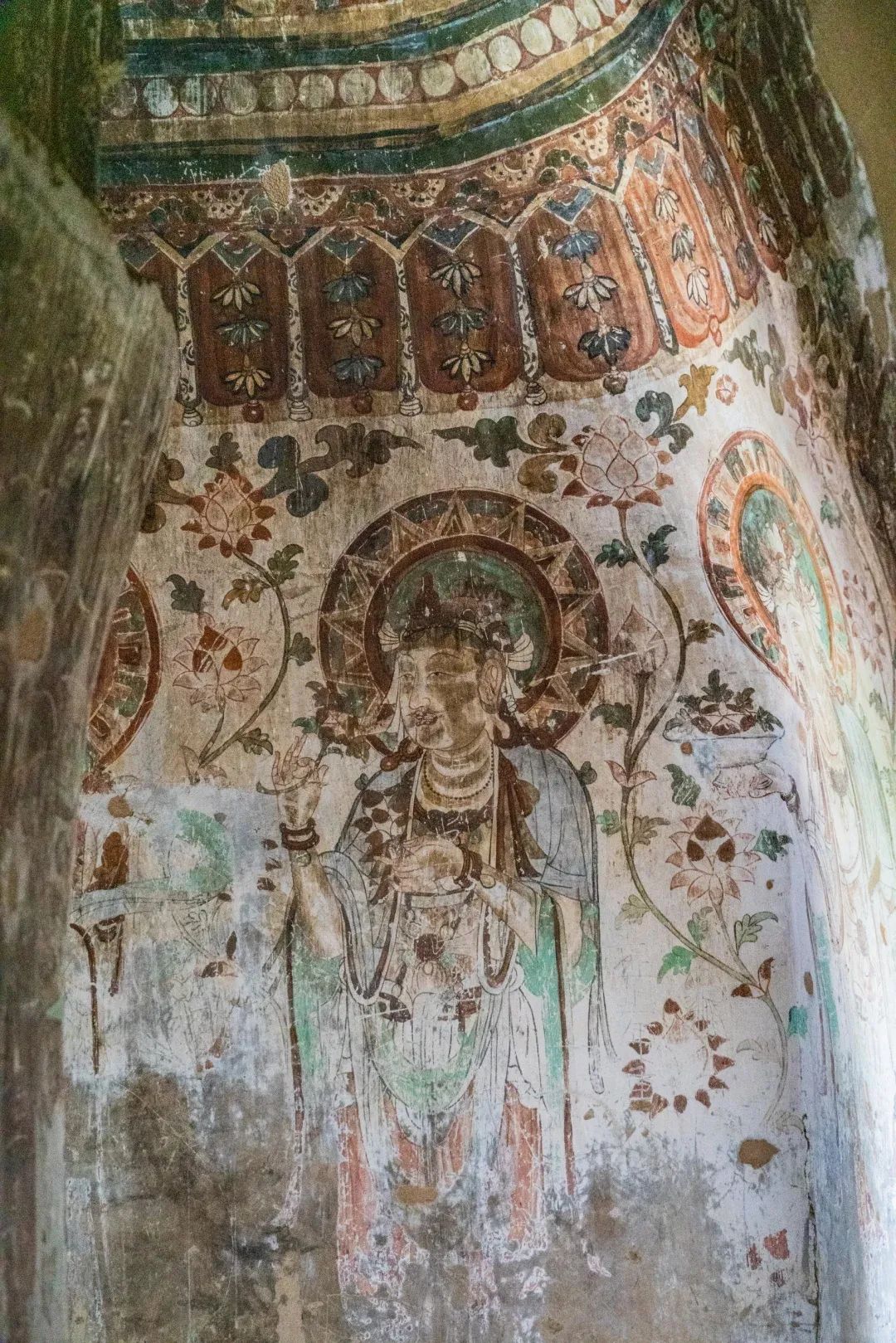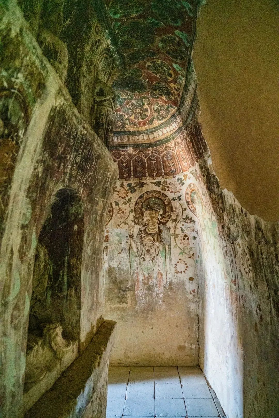 昌馬石窟第4窟洞窟形制及其殘存的塑像對于研究中國早期石窟藝術(shù)與佛教造像藝術(shù)極其重要??邇?nèi)壁畫內(nèi)容是四壁上方畫條式旌幡,下畫供養(yǎng)菩薩,身高近2米,今殘存20身,菩薩周圍畫纏枝蓮,與第二窟基本相同??唔斍鞍氩康卣檀蟛糠置撀洌拷行闹嫔喜坑覀?cè)的部位殘存龜形六瓣團(tuán)花圖案與一身飛天及菊花紋圖案。后部中心柱頂部周圍窟頂表面繪龜形六瓣團(tuán)花、連珠紋等圖案。
