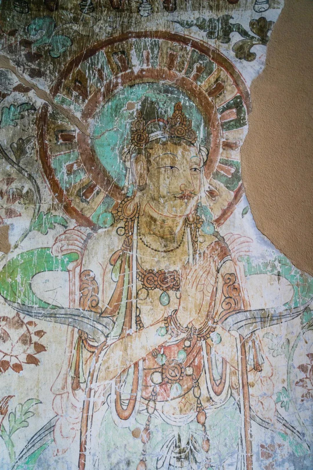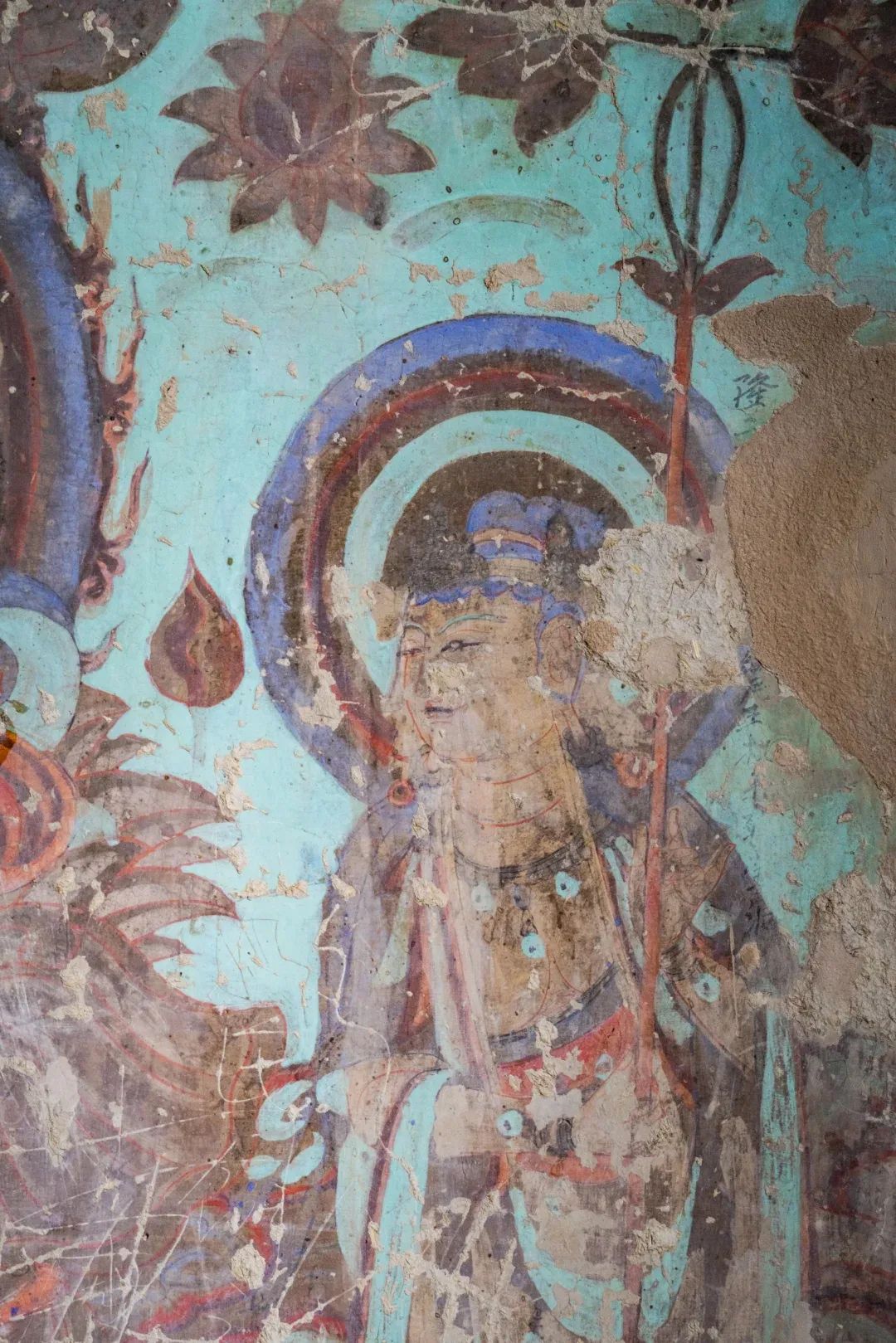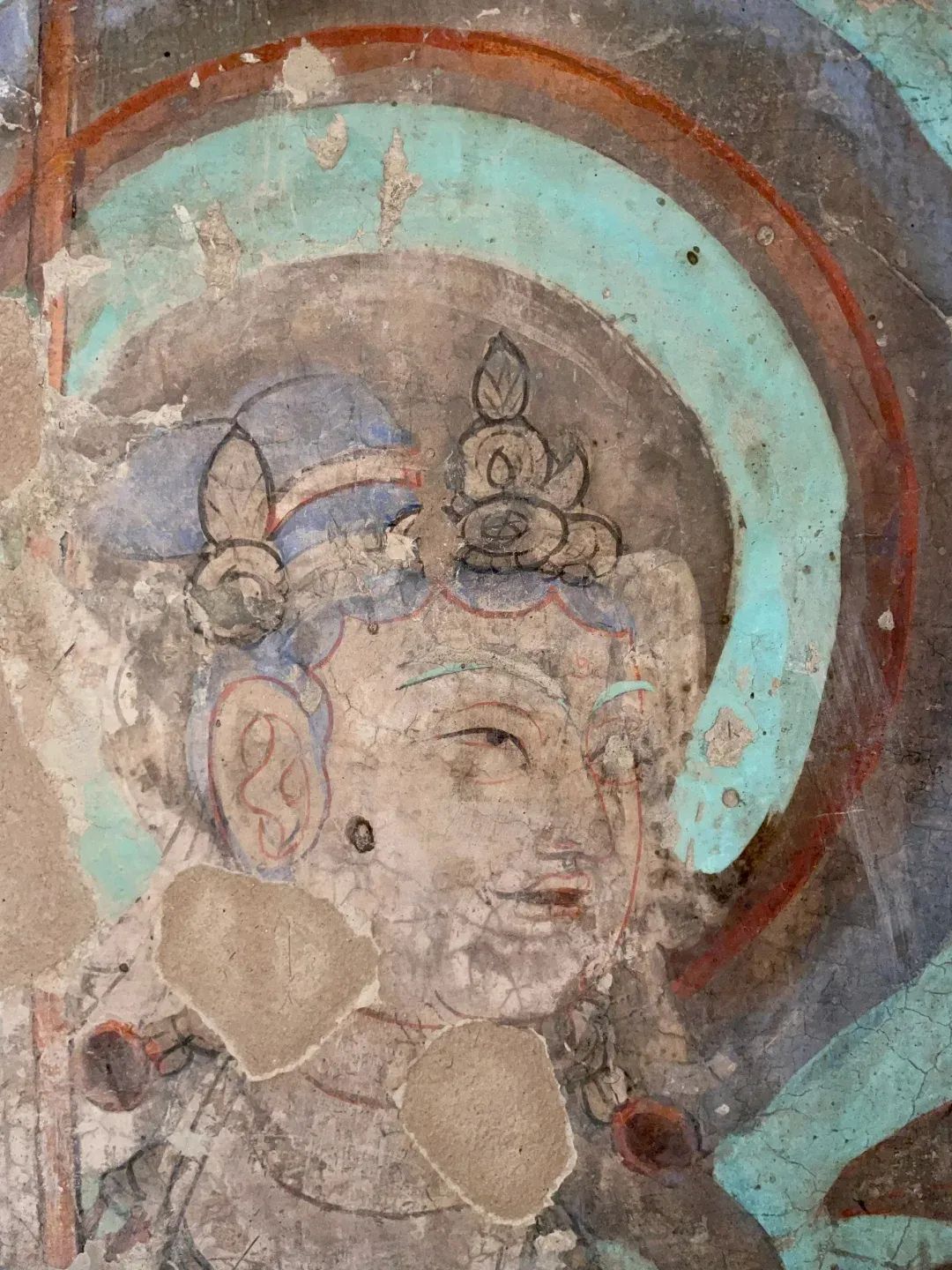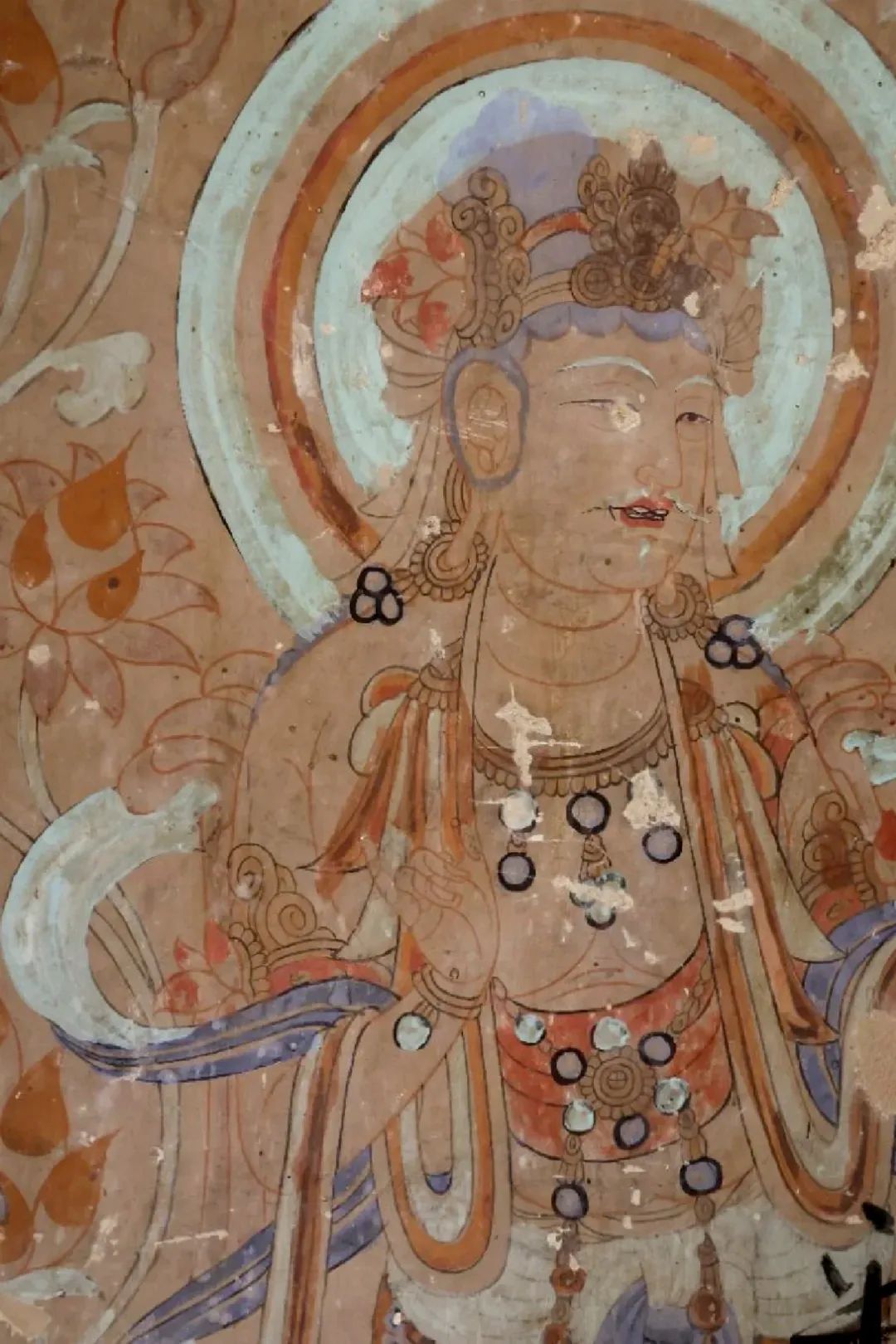 昌馬石窟第4窟洞窟形制及其殘存的塑像對于研究中國早期石窟藝術(shù)與佛教造像藝術(shù)極其重要??邇?nèi)壁畫內(nèi)容是四壁上方畫條式旌幡,下畫供養(yǎng)菩薩,身高近2米,今殘存20身,菩薩周圍畫纏枝蓮,與第二窟基本相同??唔斍鞍氩康卣檀蟛糠置撀洌拷行闹嫔喜坑覀?cè)的部位殘存龜形六瓣團(tuán)花圖案與一身飛天及菊花紋圖案。后部中心柱頂部周圍窟頂表面繪龜形六瓣團(tuán)花、連珠紋等圖案。