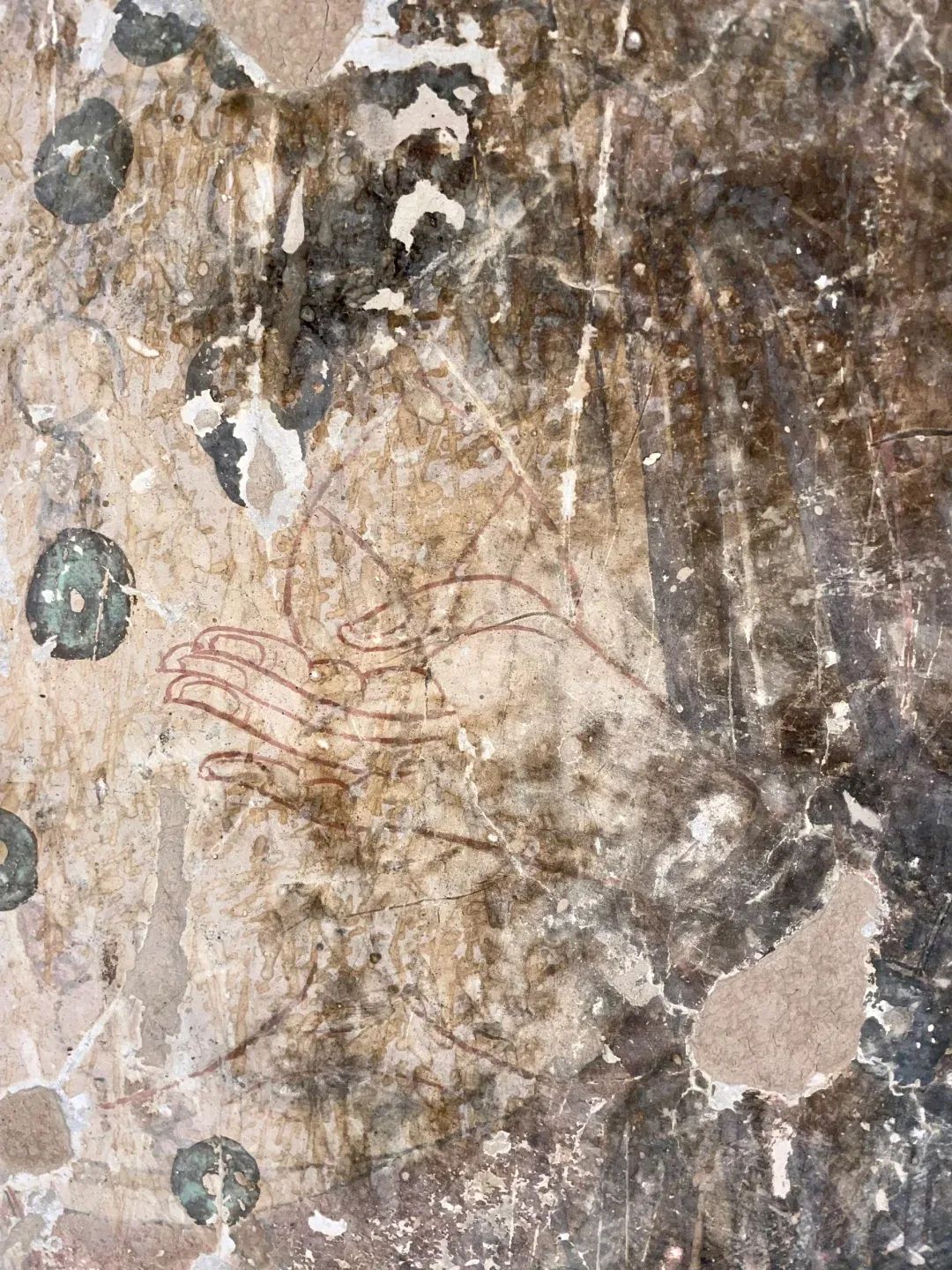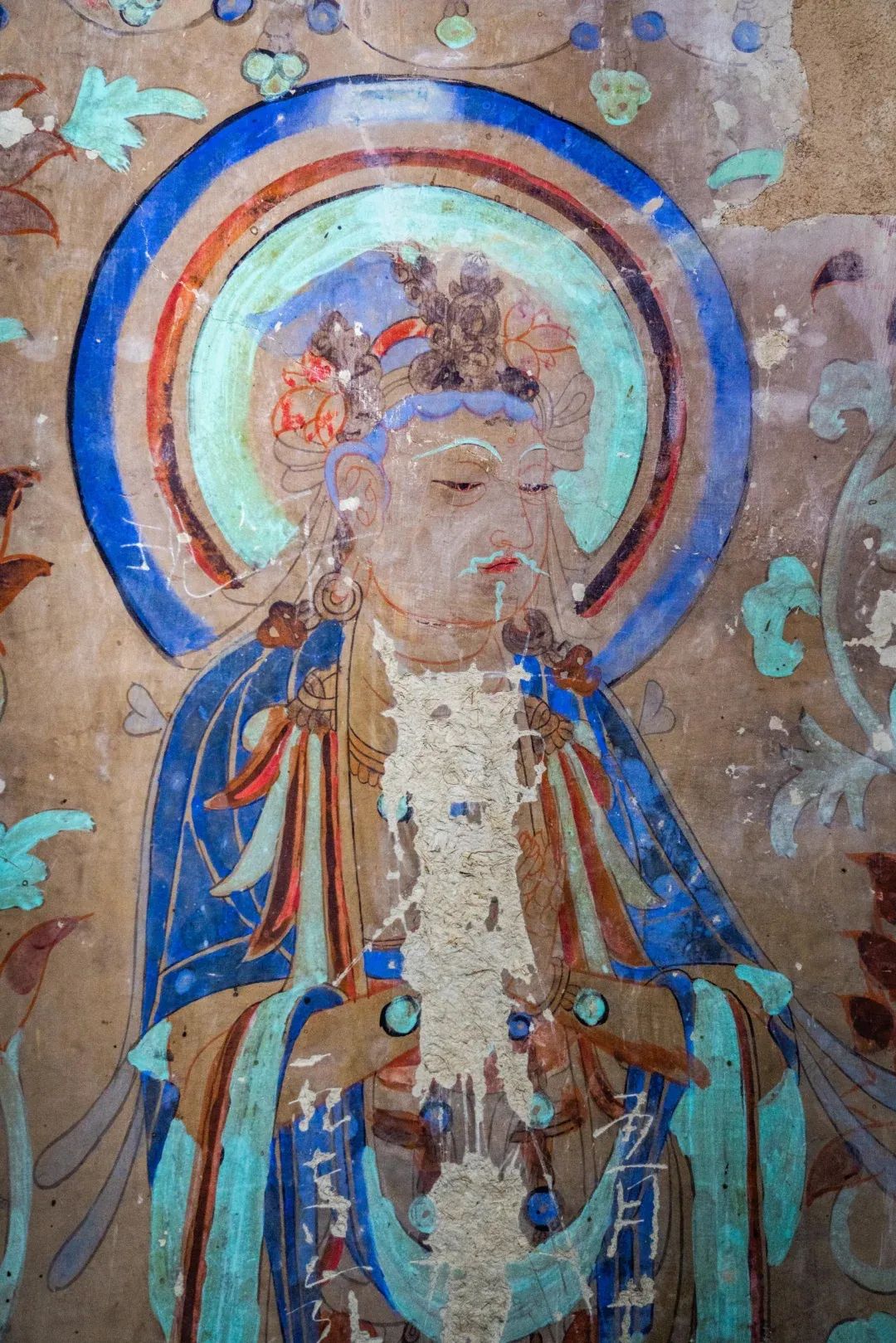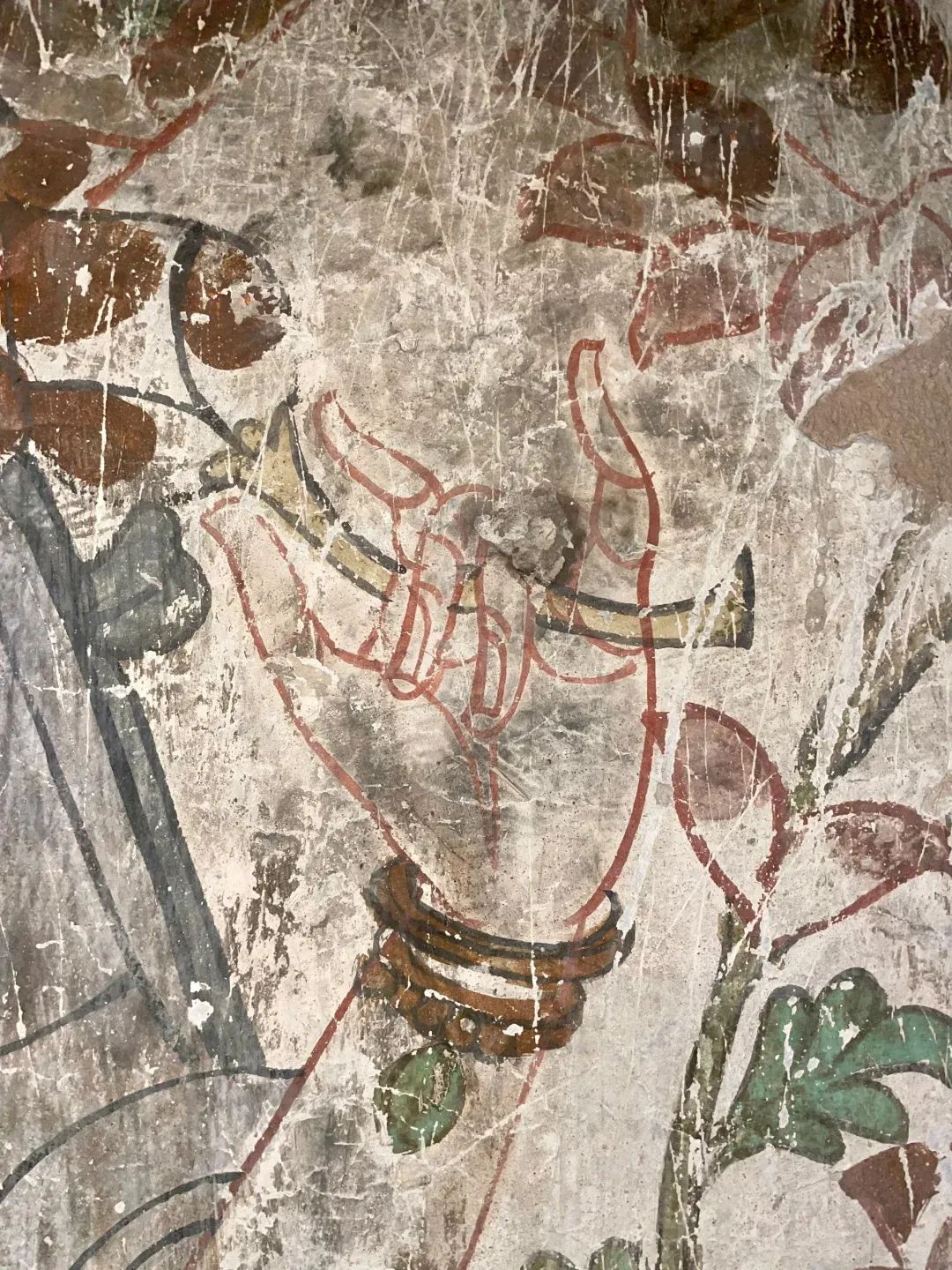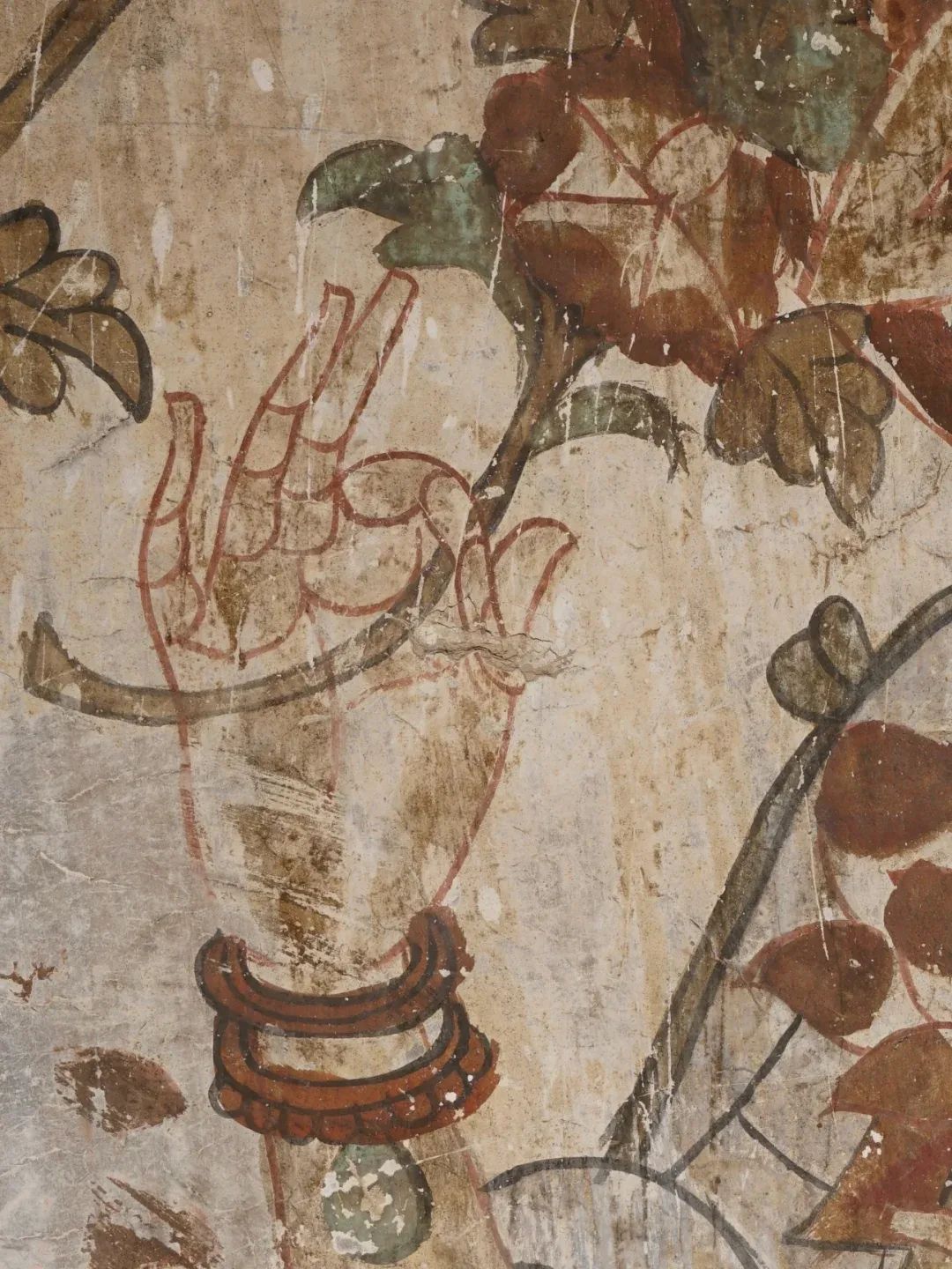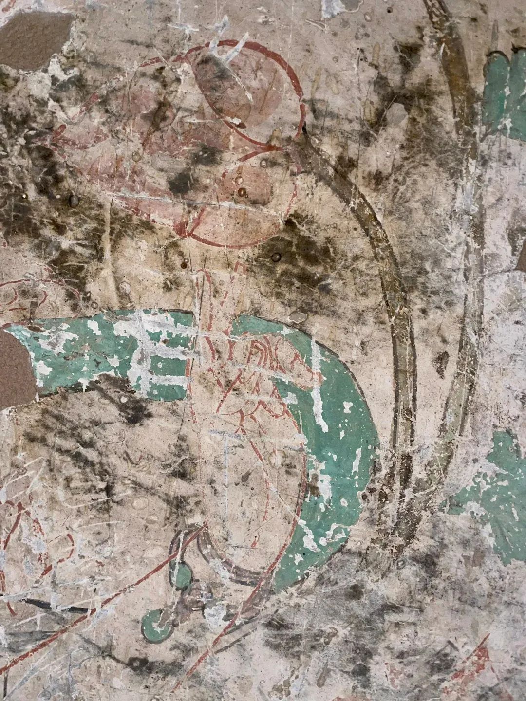 昌馬石窟第4窟洞窟形制及其殘存的塑像對于研究中國早期石窟藝術(shù)與佛教造像藝術(shù)極其重要??邇?nèi)壁畫內(nèi)容是四壁上方畫條式旌幡,下畫供養(yǎng)菩薩,身高近2米,今殘存20身,菩薩周圍畫纏枝蓮,與第二窟基本相同??唔斍鞍氩康卣檀蟛糠置撀洌拷行闹嫔喜坑覀?cè)的部位殘存龜形六瓣團(tuán)花圖案與一身飛天及菊花紋圖案。后部中心柱頂部周圍窟頂表面繪龜形六瓣團(tuán)花、連珠紋等圖案。