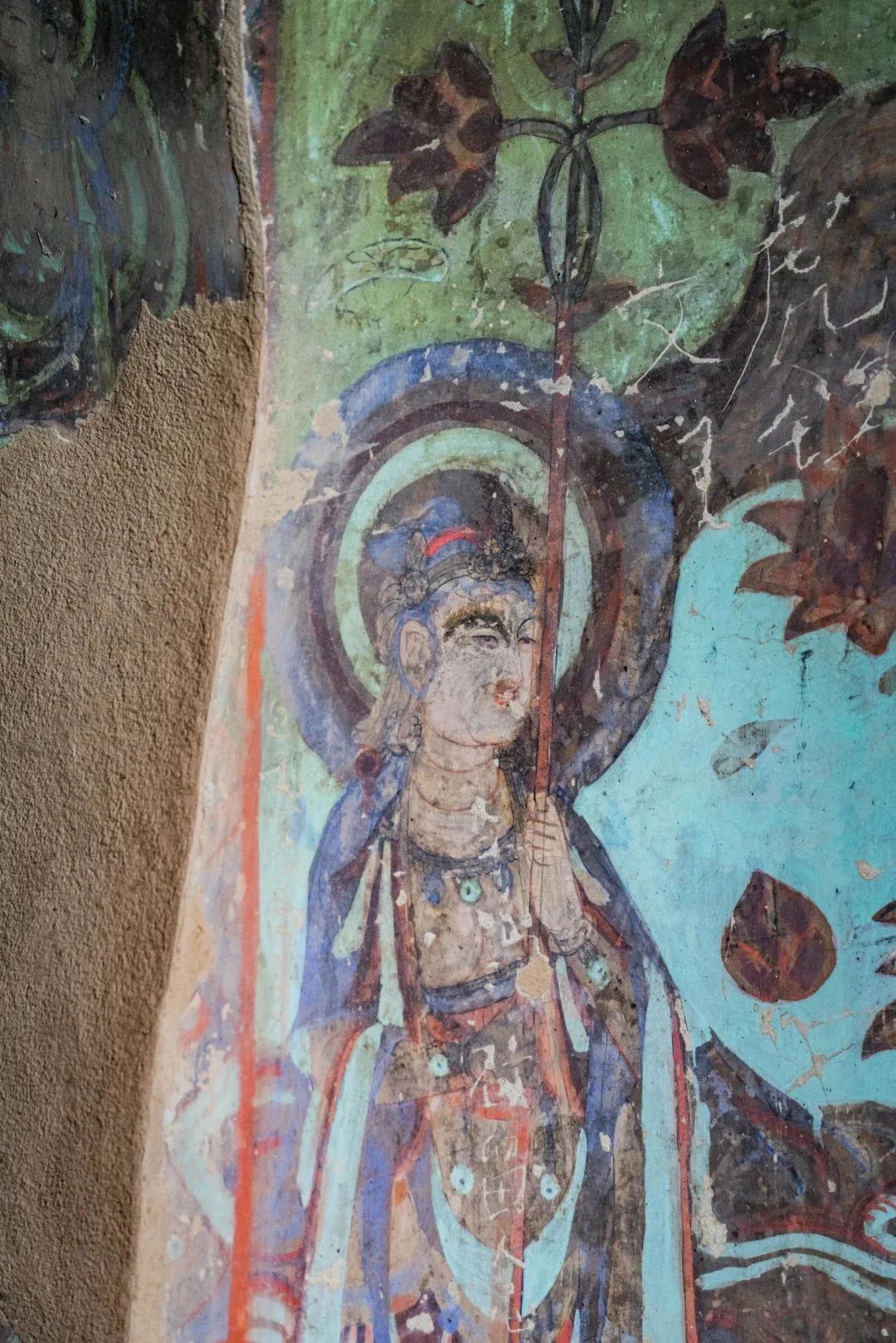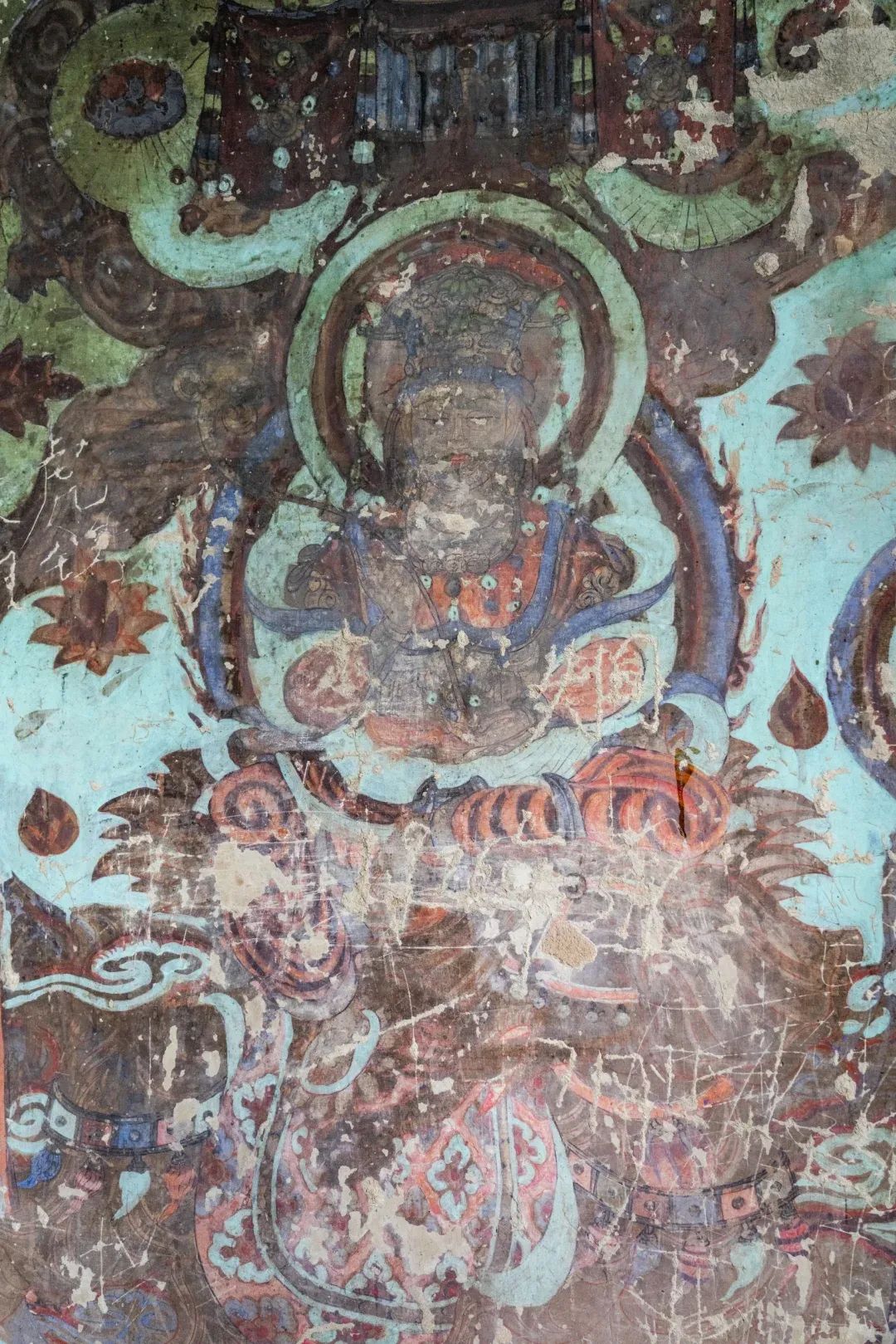 現(xiàn)在第4窟中早期塑像多數(shù)已毀,但仍殘存少數(shù)幾身,十分珍貴;各側(cè)面表層為西夏重修時繪制的壁畫;柱座與柱身的兩層自下而上逐層縮?。恢行闹嬖谖飨臅r改造成一橢圓形的大背屏,背屏正面表層為清代重繪的壁畫;四壁及頂上壁畫也多為西夏時期。