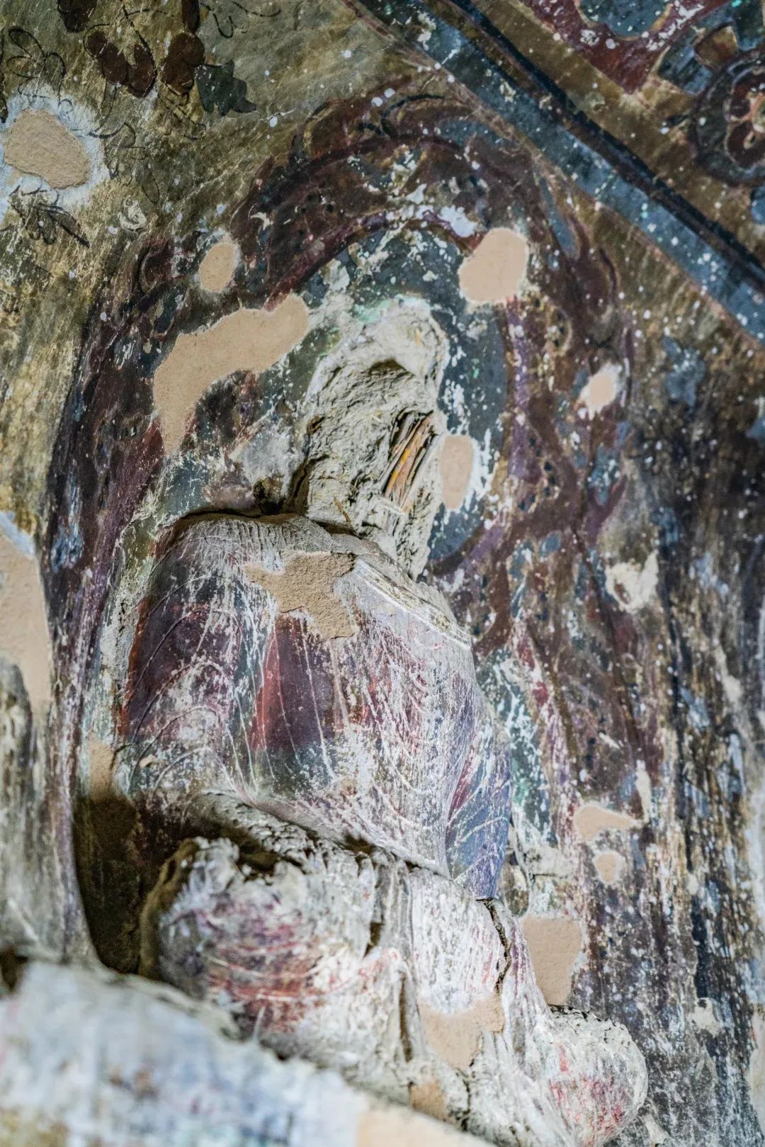 塑像題材為簡單的一佛二菩薩。內(nèi)塑一坐佛像,龕外兩側(cè)各塑一脅侍菩薩像,上層開—淺龕,中間塑一結(jié)跏趺坐佛像,面相渾圓,雙手?jǐn)n于袈裟內(nèi),衣角垂于腹前,陰線刻衣紋。頭部均毀,露出麥草扎成的骨干。龕外兩側(cè)各塑一脅侍菩薩像,雙手合十,佩項(xiàng)圈、瓔珞,披帛搭于肩上,帛帶下垂外張。佛與菩薩,作風(fēng)古樸,技法概括而又簡練,很接近敦煌莫高窟259窟,其時代可能為北涼時期。