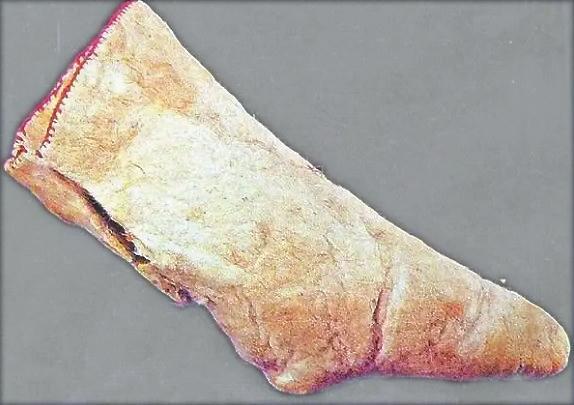 現(xiàn)代考古發(fā)現(xiàn)已證實,早期人們穿的襪子確為皮襪。目前存世較早的一雙襪子是公元前九世紀的皮氈(zhān)襪,出土于新疆塔里木盆地南緣扎洪魯克古墓中。