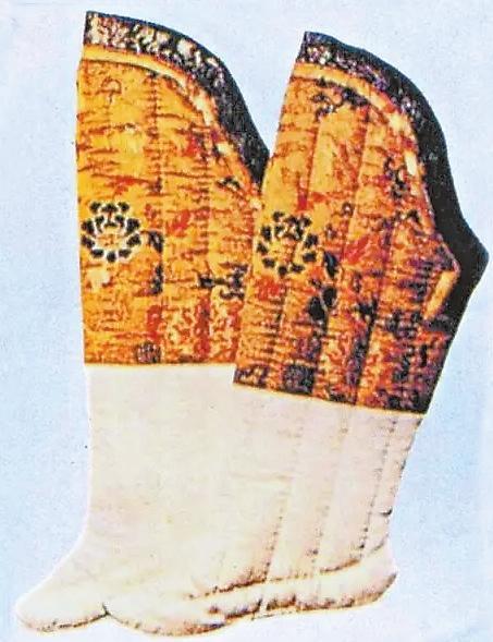 漢代的“夾襪”就是一種棉襪,這種襪子較單層襪厚實,里外兩層,故名。湖南長沙馬王堆漢墓中曾出土過兩雙夾襪,由雙層素絹縫成,襪面用絹較細,襪里用絹較粗。這是女襪,出土時放置在棺木邊箱的竹笥之內(nèi),從襪子當隨葬品來分析,那時襪子已是生活中必備衣物。